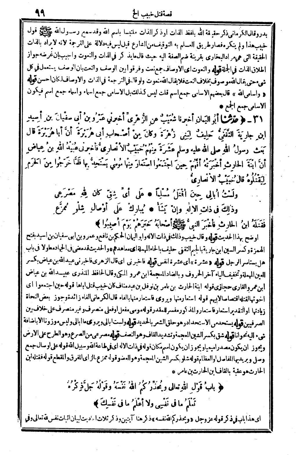 بدر. وَقَالَ الْكرْمَانِي: ذكر حَقِيقَة الله بِلَفْظ الذَّات أَو ذكر الذَّات ملتبساً باسم الله وَقد سمع رَسُول الله قَول خبيب هَذَا وَلم يُنكره فَصَارَ طَرِيق الْعلم بِهِ التَّوْقِيف من الشَّارِع، قيل: لَيْسَ فِيهِ دلَالَة على التَّرْجَمَة لِأَنَّهُ لَا يُرَاد بِالذَّاتِ الْحَقِيقَة الَّتِي هِيَ مُرَاد البُخَارِيّ بِقَرِينَة ضم الصّفة إِلَيْهِ حَيْثُ قَالَ: مَا يذكر فِي الذَّات والنعوت. وَأجِيب: بِأَن غَرَضه جَوَاز إِطْلَاق الذَّات فِي الْجُمْلَة. قَوْله: والنعوت أَي: الْأَوْصَاف جمع نعت وَفرقُوا بَين الْوَصْف والنعت بِأَن الْوَصْف يسْتَعْمل فِي كل شَيْء حَتَّى يُقَال: الله مَوْصُوف، بِخِلَاف النَّعْت فَلَا يُقَال: الله منعوت، وَلَو قَالَ فِي التَّرْجَمَة: فِي الذَّات والأوصاف لَكَانَ أحسن. قَوْله: وأسامي الله قَالَ بَعضهم: الْأَسَامِي جمع اسْم. قلت: لَيْسَ كَذَلِك، بل الْأَسَامِي جمع أَسمَاء وَأَسْمَاء جمع اسْم، فَيكون الْأَسَامِي جمع الْجمع.