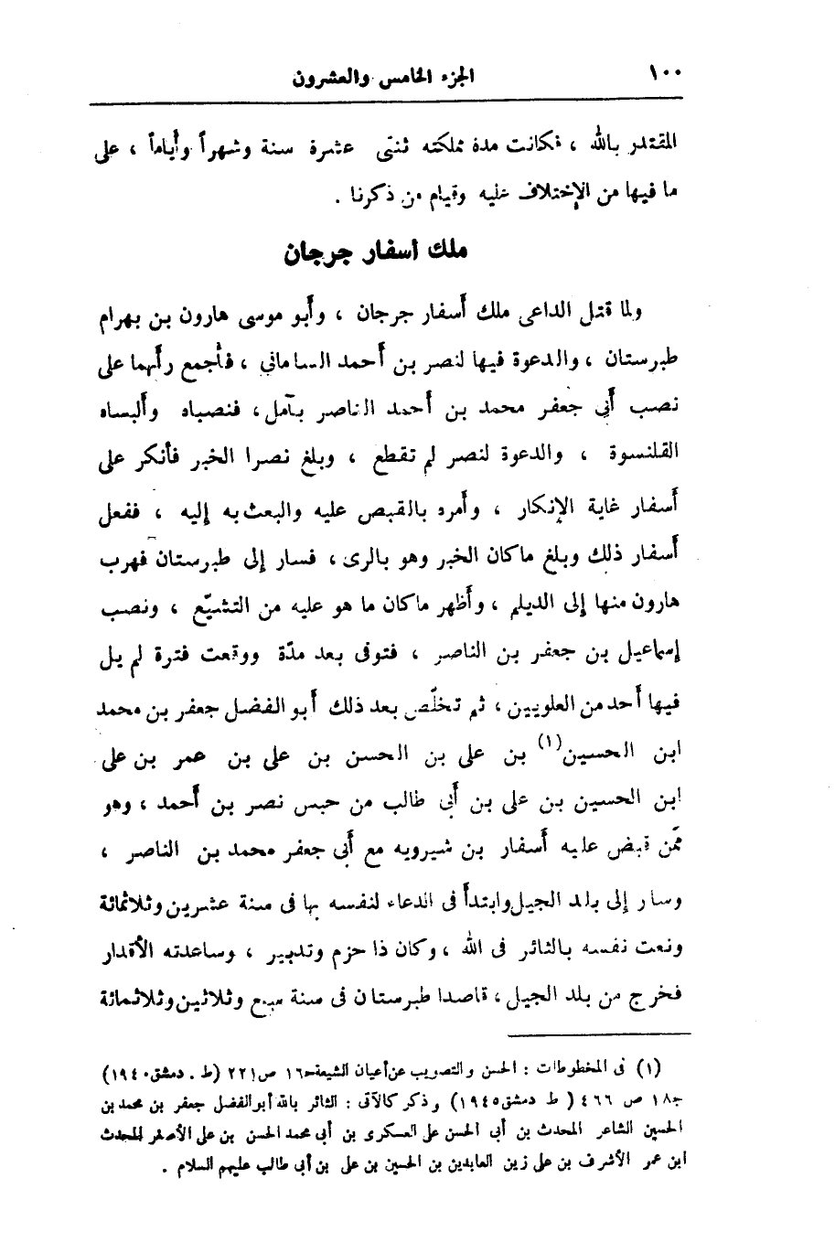 ولما قتل الداعى ملك أسفار جرجان، وأبو موسى هارون بن بهرام طبرستان، والدعوة فيها لنصر بن أحمد السامانى، فأجمع رأيهما على نصب أبى جعفر محمد بن أحمد الناصر بآمل، فنصباه وألبساه القلنسوة، والدعوة لنصر لم تقطع، وبلغ نصرا الخبر فأنكر على أسفار غاية الإنكار، وأمره بالقبص عليه والبعث به إليه، ففعل أسفار ذلك وبلغ ما كان الخبر وهو بالرى، فسار إلى طبرستان فهرب هارون منها إلى الديلم، وأظهر ما كان ما هو عليه من التشيّع، ونصب إسماعيل بن جعفر بن الناصر، فتوفى بعد مدّة ووقعت فترة لم يل فيها أحد من العلويين، ثم تخلّص بعد ذلك أبو الفضل جعفر بن محمد ابن الحسين «1» بن على بن الحسن بن على بن عمر بن على ابن الحسين بن على بن أبى طالب من حبس نصر بن أحمد، وهو ممّن قبض عليه أسفار بن شيرويه مع أبى جعفر محمد بن الناصر، وسار إلى بلد الجيل وابتدأ في الدعاء لنفسه بها في سنة عشرين وثلاثمائة ونعت نفسه بالثائر في الله، وكان ذا حزم وتدبير، وساعدته الأقدار فخرج من بلد الجيل، قاصدا طبرستان في سنة سبع وثلاثين وثلاثمائة