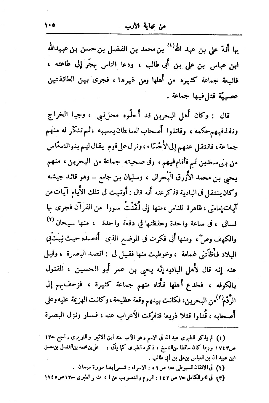 قال: وكان أهل البحرين قد أخلّوه محل نبى، وجبا الخراج ونفذ فيهم حكمه، وقاتلوا أصحاب السلطان بسببه، ثم تنكّر له منهم جماعة، فانتقل عنهم إلى الأحسّاء، ونزل على قوم يقال لهم بنو الشمّاس من بنى سعد بن تميم فأقام فيهم، وفي صحبته جماعة من البحرين، منهم يحيى بن محمد الأزرق البحرانى، وسليمان بن جامع- وهو قائد جيشه وكان ينتقل في البادية فذكر عنه أنه قال: أوتيت في تلك الأيام آيات من آيات إمامتى، ظاهرة للناس، منها إنى لقّنت سورا من القرآن فجرى بها لسانى، فى ساعة واحدة وحفظتها في دفعة واحدة، منها سبحان «2» والكهف وص، ومنها أنى فكرت في الموضع الذى أقصده حيث نبت بى البلاد فأظلتنى غمامة، وخوطبت منها فقيل لى: اقصد البصرة، وقيل عنه إنه قال لأهل الباديه إنّه يحيى بن عمر أبو الحسين، المقتول بالكوفه، فخدع أهلها فأتاه منهم جماعة كثيرة، فزحف بهم إلى الرّدم «3» من البحرين، فكانت بينهم وقعة عظيمة، وكانت الهزيمة عليه وعلى أصحابه، قتلوا قتلا ذريعا فتفرّقت الأعراب عنه، فسار ونزل البصرة