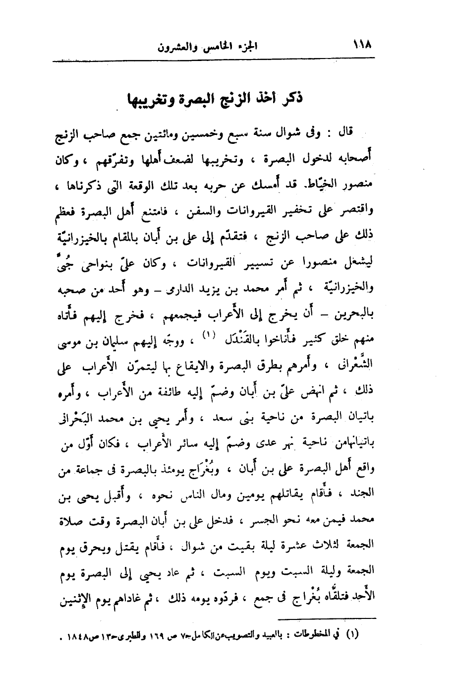 قال: وفي شوال سنة سبع وخمسين ومائتين جمع صاحب الزنج أصحابه لدخول البصرة، وتخريبها لضعف أهلها وتفرّقهم، وكان منصور الخيّاط قد أمسك عن حربه بعد تلك الوقعة التى ذكرناها، واقتصر على تخفير القيروانات والسفن، فامتنع أهل البصرة فعظم ذلك على صاحب الزنج، فتقدّم إلى على بن أبان بالمقام بالخيزرانيّة ليشغل منصورا عن تسيير القيروانات، وكان علىّ بنواحى جبىّ والخيزرانيّة، ثم أمر محمد بن يزيد الدارمى- وهو أحد من صحبه بالبحرين- أن يخرج إلى الأعراب فيجمعهم، فخرج إليهم فأتاه منهم خلق كثير فأناخوا بالقندل «1» ، ووجّه إليهم سليمان بن موسى الشّعرانى، وأمرهم بطرق البصرة والايقاع بها ليتمرّن الأعراب على ذلك، ثم انهض علىّ بن أبان وضمّ إليه طائفة من الأعراب، وأمره باتيان البصرة من ناحية بنى سعد، وأمر يحيى بن محمد البحرانى باتيانها من ناحية نهر عدى وضمّ إليه سائر الأعراب، فكان أوّل من واقع أهل البصرة على بن أبان، وبغراج يومئذ بالبصرة في جماعة من الجند، فأقام يقاتلهم يومين ومال الناس نحوه، وأقبل يحيى بن محمد فيمن معه نحو الجسر، فدخل على بن أبان البصرة وقت صلاة الجمعة لثلاث عشرة ليلة بقيت من شوال، فأقام يقتل ويحرق يوم الجمعة وليلة السبت ويوم السبت، ثم عاد يحيى إلى البصرة يوم الأحد فتلقّاه بغراج في جمع، فردّوه يومه ذلك، ثم غاداهم يوم الإثنين