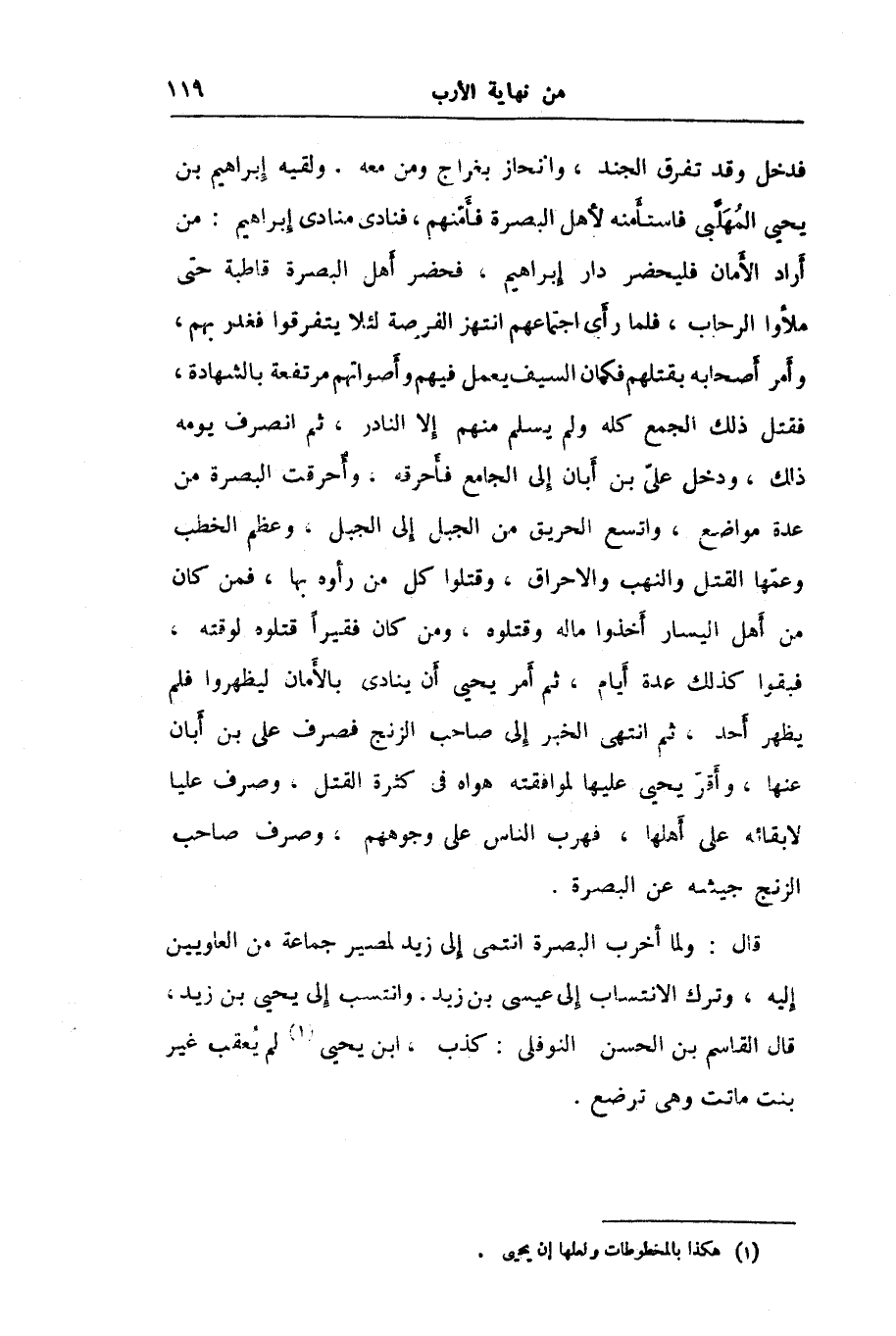 قال: ولما أخرب البصرة انتمى إلى زيد لمصير جماعة من العلويين إليه، وترك الانتساب إلى عيسى بن زيد، وانتسب إلى يحيى بن زيد، قال القاسم بن الحسن النوفلى: كذب، ابن يحيى «1» لم يعقب غير بنت ماتت وهى ترضع.