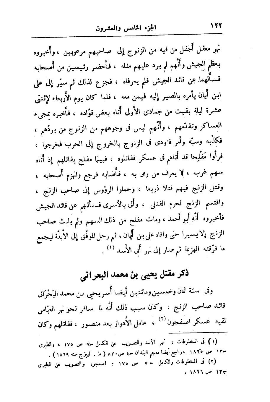 وفي سنة ثمان وخمسين ومائتين أيضا أسر يحيى بن محمد البحرانى قائد صاحب الزنج، وكان سبب ذلك أنّه لما سافر نحو نهر العبّاس لقيه عسكر اصفجون «2» ، عامل الأهواز بعد منصور، فقاتلهم وكان