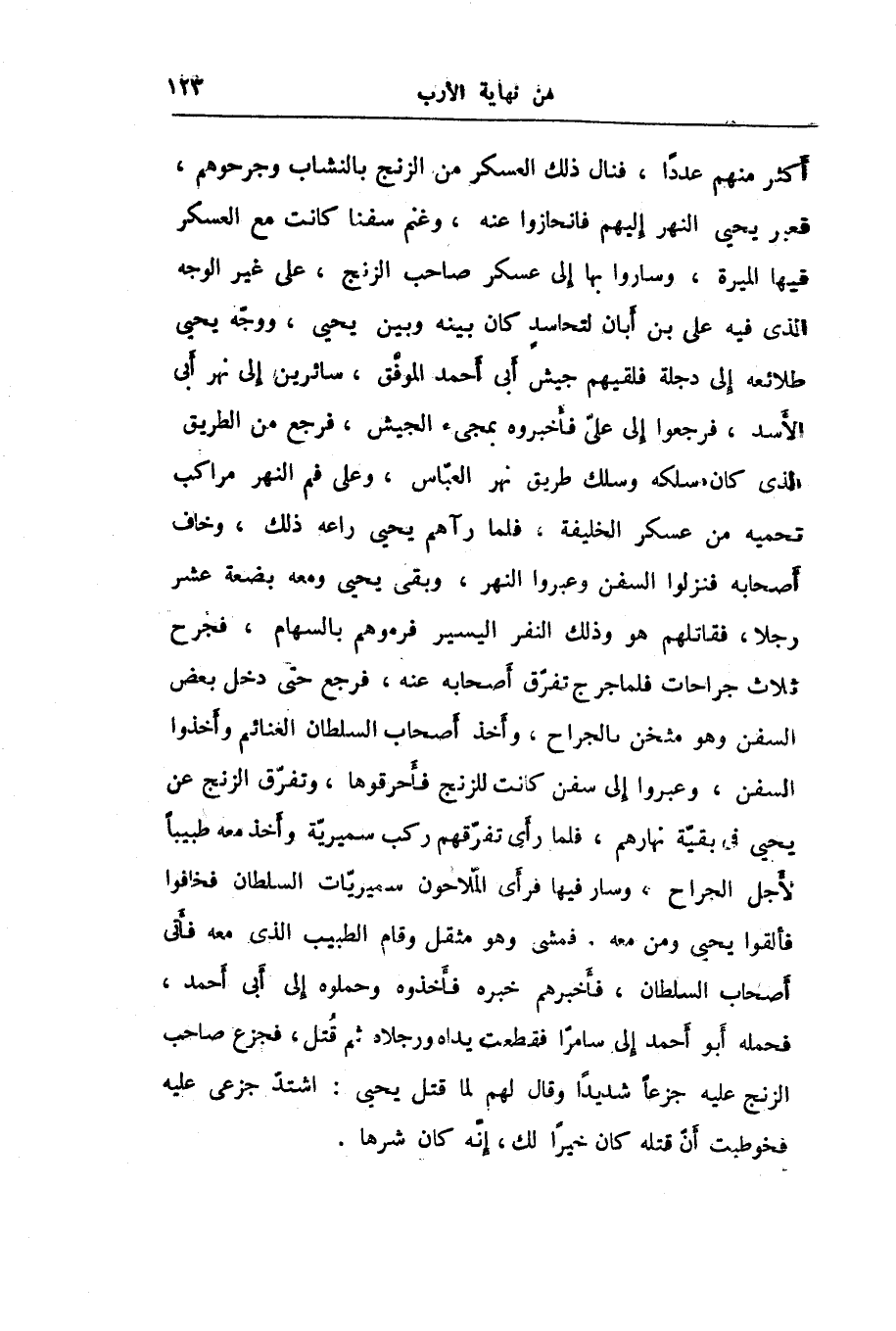 أكثر منهم عددا، فنال ذلك العسكر من الزنج بالنشاب وجرحوهم، فعبر يحيى النهر إليهم فانحازوا عنه، وغنم سفنا كانت مع العسكر فيها الميرة، وساروا بها إلى عسكر صاحب الزنج، على غير الوجه الذى فيه على بن أبان لتحاسد كان بينه وبين يحيى، ووجّه يحيى طلائعه إلى دجلة فلقيهم جيش أبى أحمد الموفّق، سائرين إلى نهر أبى الأسد، فرجعوا إلى علىّ فأخبروه بمجىء الجيش، فرجع من الطريق الذى كان سلكه وسلك طريق نهر العبّاس، وعلى فم النهر مراكب تحميه من عسكر الخليفة، فلما رآهم يحيى راعه ذلك، وخاف أصحابه فنزلوا السفن وعبروا النهر، وبقى يحيى ومعه بضعة عشر رجلا، فقاتلهم هو وذلك النفر اليسير فرموهم بالسهام، فجرح ثلاث جراحات فلما جرج تفرّق أصحابه عنه، فرجع حتى دخل بعض السفن وهو مثخن بالجراح، وأخذ أصحاب السلطان الغنائم وأخذوا السفن، وعبروا إلى سفن كانت للزنج فأحرقوها، وتفرّق الزنج عن يحيى في بقيّة نهارهم، فلما رأى تفرّقهم ركب سميريّة وأخذ معه طبيبا لأجل الجراح، وسار فيها فرأى الملّاحون سميريّات السلطان فخافوا فألقوا يحيى ومن معه. فمشى وهو مثقل وقام الطبيب الذى معه فأتى أصحاب السلطان، فأخبرهم خبره فأخذوه وحملوه إلى أبى أحمد، فحمله أبو أحمد إلى سامرّا فقطعت يداه ورجلاه ثم قتل، فجزع صاحب الزنج عليه جزعا شديدا وقال لهم لما قتل يحيى: اشتدّ جزعى عليه فخوطبت أنّ قتله كان خيرا لك، إنّه كان شرها.