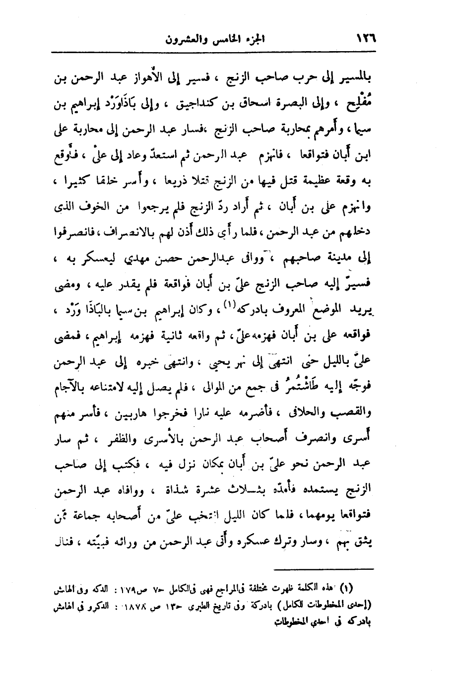 بالمسير إلى حرب صاحب الزنج، فسير إلى الأهواز عبد الرحمن بن مفلح، وإلى البصرة اسحاق بن كنداجيق، وإلى باذاورد إبراهيم بن سيما، وأمرهم بمحاربة صاحب الزنج، فسار عبد الرحمن إلى محاربة على ابن أبان فتواقعا، فانهزم عبد الرحمن ثم استعدّ وعاد إلى على، فأوقع به وقعة عظيمة قتل فيها من الزنج قتلا ذريعا، وأسر خلقا كثيرا، وانهزم على بن أبان، ثم أراد ردّ الزنج فلم يرجعوا من الخوف الذى دخلهم من عبد الرحمن، فلما رأى ذلك أذن لهم بالانصراف، فانصرفوا إلى مدينة صاحبهم، ووافى عبد الرحمن حصن مهدي ليعسكر به، فسيّر إليه صاحب الزنج علىّ بن أبان فواقعة فلم يقدر عليه، ومضى يريد الموضع المعروف بادركه «1» ، وكان إبراهيم بن سيما بالباذاورد، فواقعه على بن أبان فهزمه علىّ، ثم واقعه ثانية فهزمه إبراهيم، فمضى علىّ بالليل حتى انتهى إلى نهر يحيى، وانتهى خبره إلى عبد الرحمن فوجّه إليه طاشتمر في جمع من الموالى، فلم يصل إليه لامتناعه بالآجام والقصب والحلافى، فأضرمه عليه نارا فخرجوا هاربين، فأسر منهم أسرى وانصرف أصحاب عبد الرحمن بالأسرى والظفر، ثم سار عبد الرحمن نحو علىّ بن أبان بمكان نزل فيه، فكتب إلى صاحب الزنج يستمده فأمدّه بثلاث عشرة شذاة، ووافاه عبد الرحمن فتواقعا يومهما، فلما كان الليل انتخب علىّ من أصحابه جماعة ممّن يثق بهم، وسار وترك عسكره وأتى عبد الرحمن من ورائه فبيّته، فنال