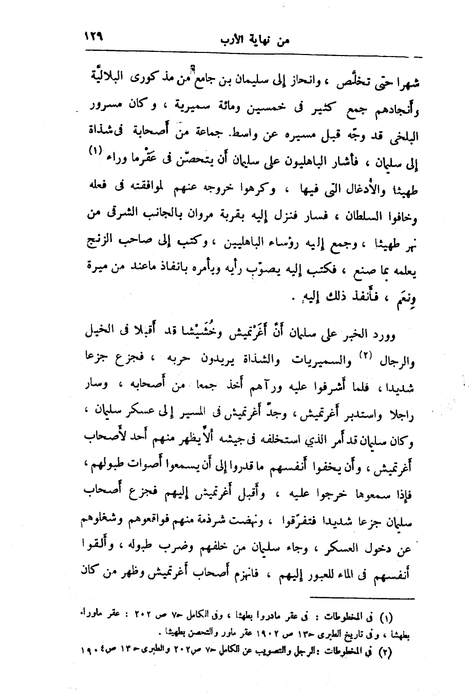 وورد الخبر على سليمان أنّ أغرتميش وخشيشا قد أقبلا في الخيل والرجال «2» والسميريات والشذاة يريدون حربه، فجزع جزعا شديدا، فلما أشرفوا عليه ورآهم أخذ جمعا من أصحابه، وسار راجلا واستدبر أغرتميش، وجدّ أغرتميش في المسير إلى عسكر سليمان، وكان سليمان قد أمر الذي استخلفه في جيشه ألّا يظهر منهم أحد لأصحاب أغرتميش، وأن يخفوا أنفسهم ما قدروا إلى أن يسمعوا أصوات طبولهم، فإذا سمعوها خرجوا عليه، وأقبل أغرتميش إليهم فجزع أصحاب سليمان جزعا شديدا فتفرّقوا، ونهضت شرذمة منهم فواقعوهم وشغلوهم عن دخول العسكر، وجاء سليمان من خلفهم وضرب طبوله، وألقوا أنفسهم في الماء للعبور إليهم، فانهزم أصحاب أغرتميش وظهر من كان