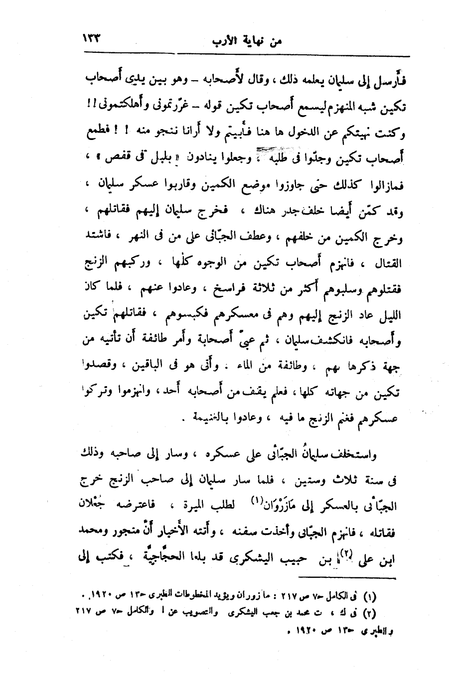 فأرسل إلى سليمان يعلمه ذلك، وقال لأصحابه- وهو بين يدى أصحاب تكين شبه المنهزم ليسمع أصحاب تكين قوله- غرّرتمونى وأهلكتمونى!! وكنت نهيتكم عن الدخول هاهنا فأبيتم ولا أرانا ننجو منه!! فطمع أصحاب تكين وجدّوا في طلبه، وجعلوا ينادون «بلبل في قفص» ، فما زالوا كذلك حتى جاوزوا موضع الكمين وقاربوا عسكر سليمان، وقد كمّن أيضا خلف جدر هناك، فخرج سليمان إليهم فقاتلهم، وخرج الكمين من خلفهم، وعطف الجبّائى على من في النهر، فاشتد القتال، فانهزم أصحاب تكين من الوجوه كلها، وركبهم الزنج فقتلوهم وسلبوهم أكثر من ثلاثة فراسخ، وعادوا عنهم، فلما كان الليل عاد الزنج إليهم وهم في معسكرهم فكبسوهم، فقاتلهم تكين وأصحابه فانكشف سليمان، ثم عبىّ أصحابة وأمر طائفة أن تأتيه من جهة ذكرها بهم، وطائفة من الماء، وأتى هو في الباقين، وقصدوا تكين من جهاته كلها، فعلم يقف من أصحابه أحد، وانهزموا وتركوا عسكرهم فغنم الزنج ما فيه، وعادوا بالغنيمة.