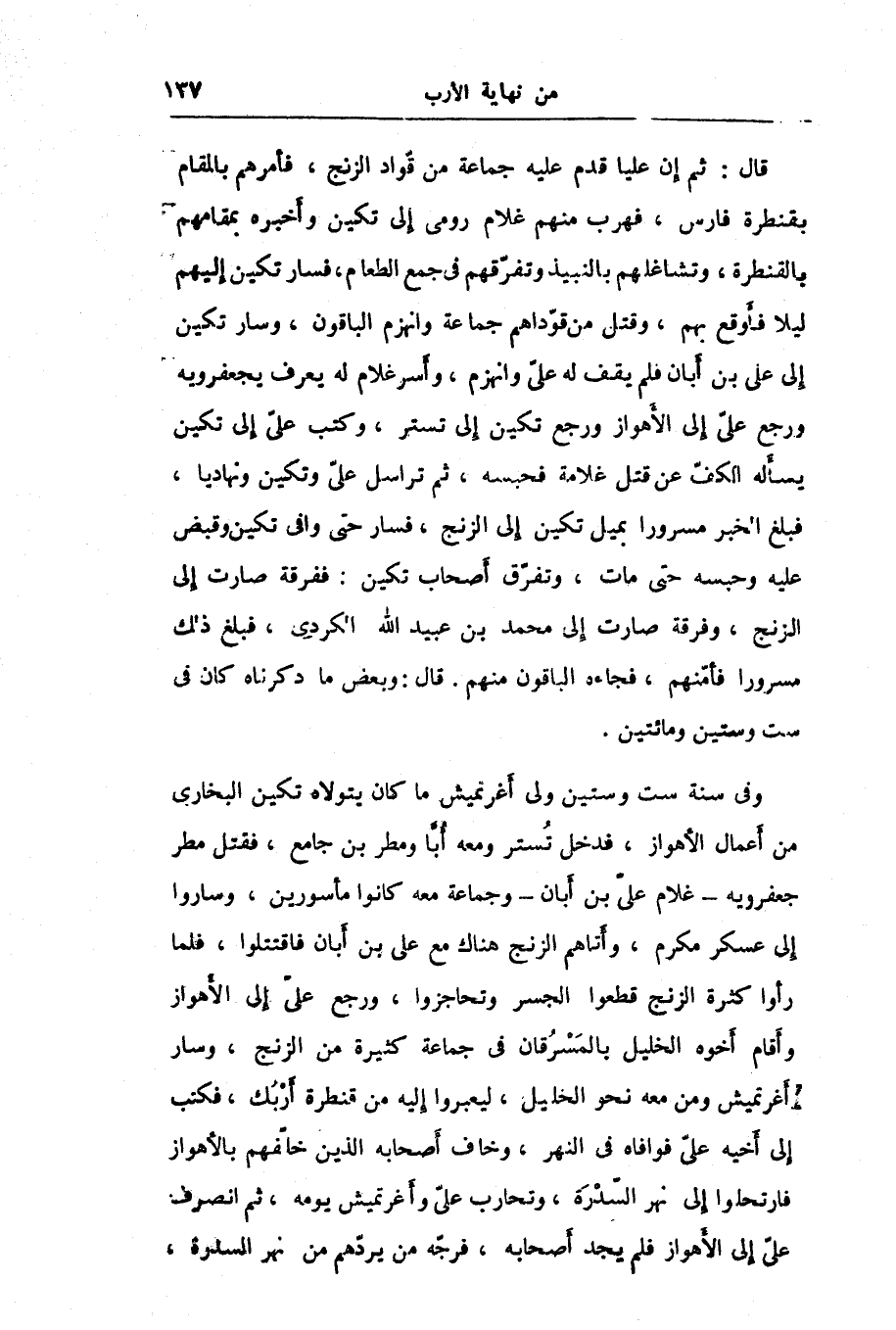 قال: ثم إن عليا قدم عليه جماعة من قوّاد الزنج، فأمرهم بالمقام بقنطرة فارس، فهرب منهم غلام رومى إلى تكين وأخبره بمقامهم بالقنطرة، وتشاغلهم بالنبيذ وتفرّقهم في جمع الطعام، فسار تكين إليهم ليلا فأوقع بهم، وقتل من قوّادهم جماعة وانهزم الباقون، وسار تكين إلى على بن أبان فلم يقف له علىّ وانهزم، وأسر غلام له يعرف يجعفرويه ورجع علىّ إلى الأهواز ورجع تكين إلى تستر، وكتب علىّ إلى تكين يسأله الكفّ عن قتل غلامة فحبسه، ثم تراسل علىّ وتكين ونهاديا، فبلغ الخبر مسرورا بميل تكين إلى الزنج، فسار حتى وافى تكين وقبض عليه وحبسه حتى مات، وتفرّق أصحاب تكين: ففرقة صارت إلى الزنج، وفرقة صارت إلى محمد بن عبيد الله الكردى، فبلغ ذلك مسرورا فأمّنهم، فجاءه الباقون منهم. قال: وبعض ما ذكرناه كان في ست وستين ومائتين.