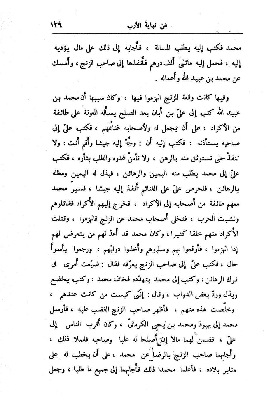 وفيها كانت وقعة للزنج انهزموا فيها، وكان سببها أن محمد بن عبيد الله كتب إلى علىّ بن أبان بعد الصلح يسأله المعونة على طائفة من الأكراد، على أن يجعل له ولأصحابه غنائمهم، فكتب علىّ إلى صاحبه يستأذنه، فكتب إليه أن: وجّه إليه جيشا وأقم أنت، ولا تنفذ حتى تستوثق منه بالرهن، ولا تأمن غدره والطلب بثأره، فكتب علىّ إلى محمد يطلب منه اليمين والرهائن، فبذل له اليمين ومطله بالرهائن، فلحرص علىّ على الغنائم أنفذ إليه جيشا، فسير محمد معهم طائفة من أصحابه إلى الأكراد، فخرج إليهم الأكراد فقاتلوهم ونشبت الحرب، فتخلى أصحاب محمد عن الزنج فانهزموا، وقتلت الأكراد منهم خلقا كثيرا، وكان محمد قد أعدّ لهم من يتعرض لهم إذا انهزموا، فأوقعوا بهم وسلبوهم وأخذوا دوابّهم، ورجعوا بأسوأ حال، فكتب علىّ إلى صاحب الزنج يعرّفه فقال: ضيّعت أمرى في ترك الرهائن، وكتب إلى محمد يتهدّده فخاف محمد، وكتب يخضع ويذل وردّ بعض الدواب، وقال: إنّنى كبست من كانت عندهم، وخلّصت هذه منهم، فأظهر صاحب الزنج الغضب عليه، فأرسل محمد إلى بهبوذ ومحمد بن يحيى الكرمانىّ، وكان أقرب الناس إلى علىّ، فضمن لهما ما لا إن أصلحا له عليا وصاحبه ففعلا ذلك، وأجابهما صاحب الزنج بالرضا عن محمد، على أن يخطب له على منابر بلاده، فأعلما محمدا ذلك فأجابهما إلى جميع ما طلبا، وجعل