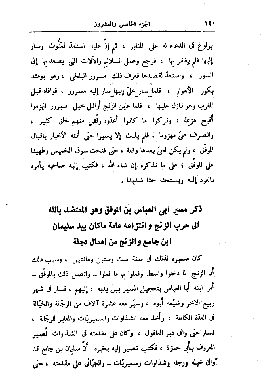 كان مسيره لذلك في سنة ست وستين ومائتين، وسبب ذلك أن الزنج لما دخلوا واسط وفعلوا بها ما فعلوا- واتصل ذلك بالموفّق- أمر ابنه أبا العباس بتعجيل المسير بين يديه، إليهم، فسار في شهر ربيع الآخر وشيّعه أبوه، وسيّر معه عشرة آلاف من الرجّالة والخيّالة فى العدّة الكاملة، وأخذ معه الشذاوات والسميريّات والمعابر للرجّالة، فسار حتى وافى دير العاقول، وكان على مقدمته في الشذاوات نصير المعروف بأبى حمزة، فكتب نصير إليه يخبره أنّ سليمان بن جامع قد وافى خيله ورجله وشذاوات وسميريّات- والجبّائى على مقدمته، حتى