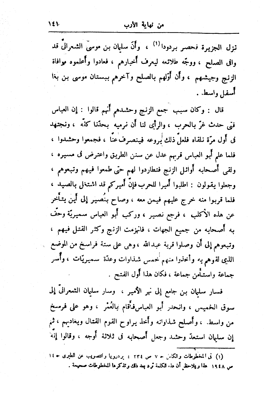 نزل الجزيرة فحصر بردودا «1» ، وأنّ سليمان بن موسى الشعرانىّ قد وافى الصلح، ووجّه طلائعه ليعرف أخبارهم، فعادوا وأعلموه موافاة الزنج وجيشهم، وأن أوّلهم بالصلح وآخرهم ببستان موسى بن بغا أسفل واسط.