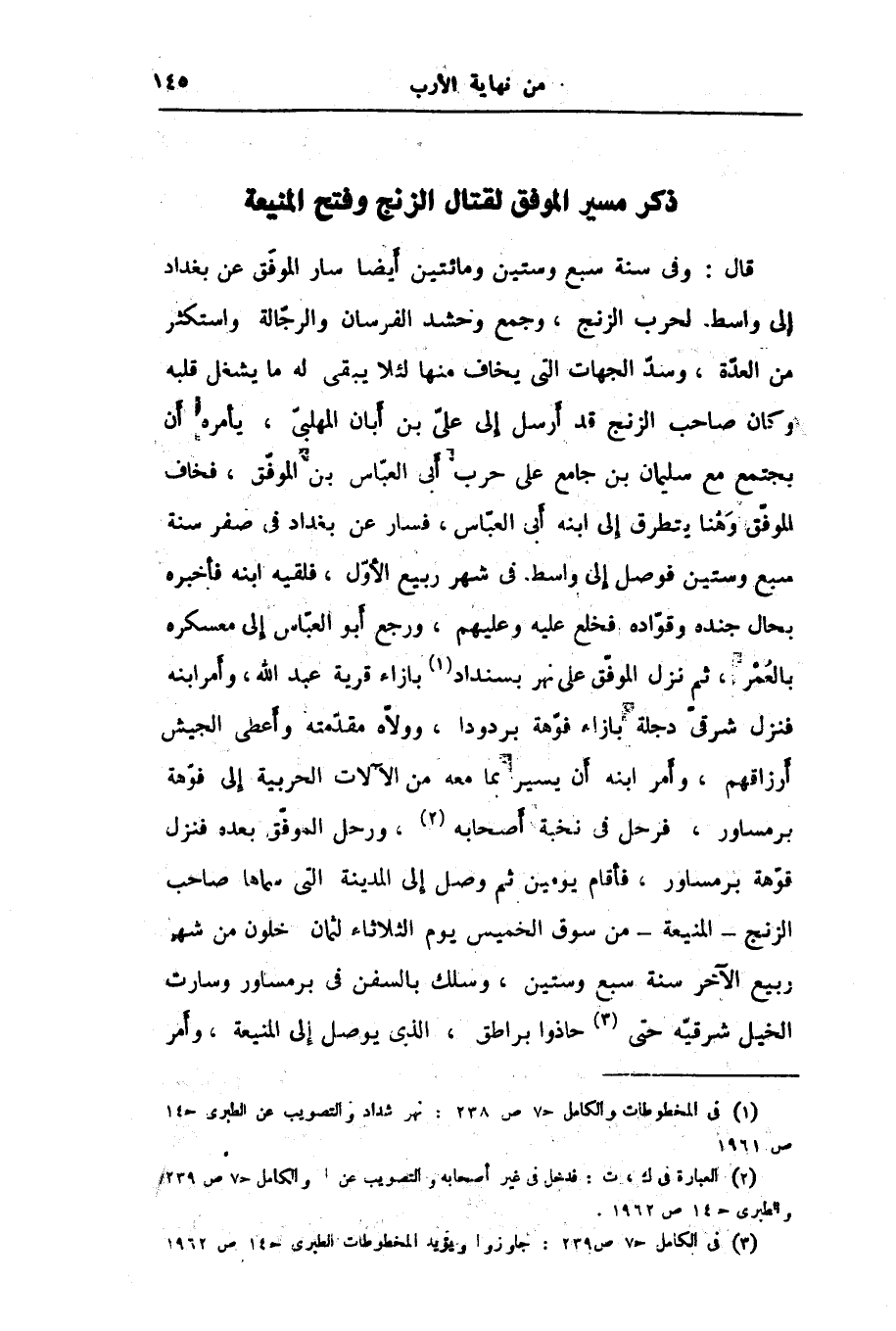 قال: وفي سنة سبع وستين ومائتين أيضا سار الموفّق عن بغداد إلى واسط لحرب الزنج، وجمع وحشد الفرسان والرجّالة واستكثر من العدّة، وسدّ الجهات التى يخاف منها لئلا يبقى له ما يشغل قلبه وكان صاحب الزنج قد أرسل إلى علىّ بن أبان المهلبىّ، يأمره أن يجتمع مع سليمان بن جامع على حرب أبى العبّاس بن الموفّق، فخاف الموفّق وهنا يتطرق إلى ابنه أبى العبّاس، فسار عن بغداد في صفر سنة سبع وستين فوصل إلى واسط في شهر ربيع الأوّل، فلقيه ابنه فأخبره بحال جنده وقوّاده فخلع عليه وعليهم، ورجع أبو العبّاس إلى معسكره بالعمر، ثم نزل الموفّق على نهر بسنداد «1» بازاء قرية عبد الله، وأمر ابنه فنزل شرقىّ دجلة بازاء فوّهة بردودا، وولّاه مقدّمته وأعطى الجيش أرزاقهم، وأمر ابنه أن يسير بما معه من الآلات الحربية إلى فوّهة برمساور، فرحل في نخبة أصحابه «2» ، ورحل الموفّق بعده فنزل قوّهة برمساور، فأقام يومين ثم وصل إلى المدينة التى سماها صاحب الزنج- المنيعة- من سوق الخميس يوم الثلاثاء لثمان خلون من شهر ربيع الآخر سنة سبع وستين، وسلك بالسفن في برمساور وسارت الخيل شرقيّه حتى «3» حاذوا براطق، الذى يوصل إلى المنيعة، وأمر