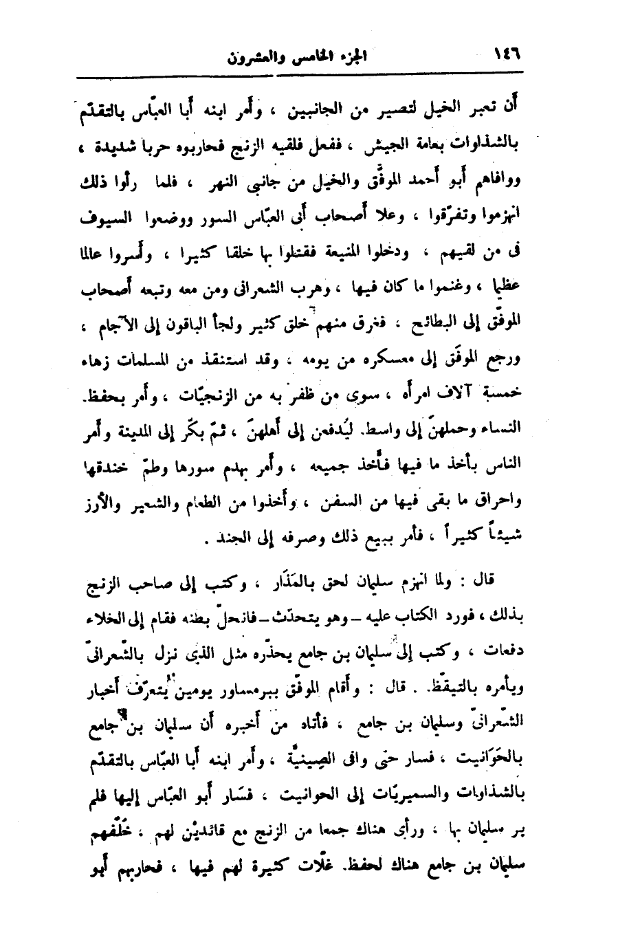 قال: ولما انهزم سليمان لحق بالمذار، وكتب إلى صاحب الزنج بذلك، فورد الكتاب عليه- وهو يتحدّث- فانحلّ بطنه فقام إلى الخلاء دفعات، وكتب إلى سليمان بن جامع يحذّره مثل الذى نزل بالشّعرانىّ ويأمره بالتيقّظ. قال: وأقام الموفّق ببر مساور يومين يتعرّف أخبار الشّعرانىّ وسليمان بن جامع، فأتاه من أخبره أن سليمان بن جامع بالحوانيت، فسار حتى وافى الصينيّة، وأمر ابنه أبا العبّاس بالتقدّم بالشذاوات والسميريّات إلى الحوانيت، فسار أبو العبّاس إليها فلم ير سليمان بها، ورأى هناك جمعا من الزنج مع قائدين لهم، خلّفهم سليمان بن جامع هناك لحفظ غلّات كثيرة لهم فيها، فحاربهم أبو