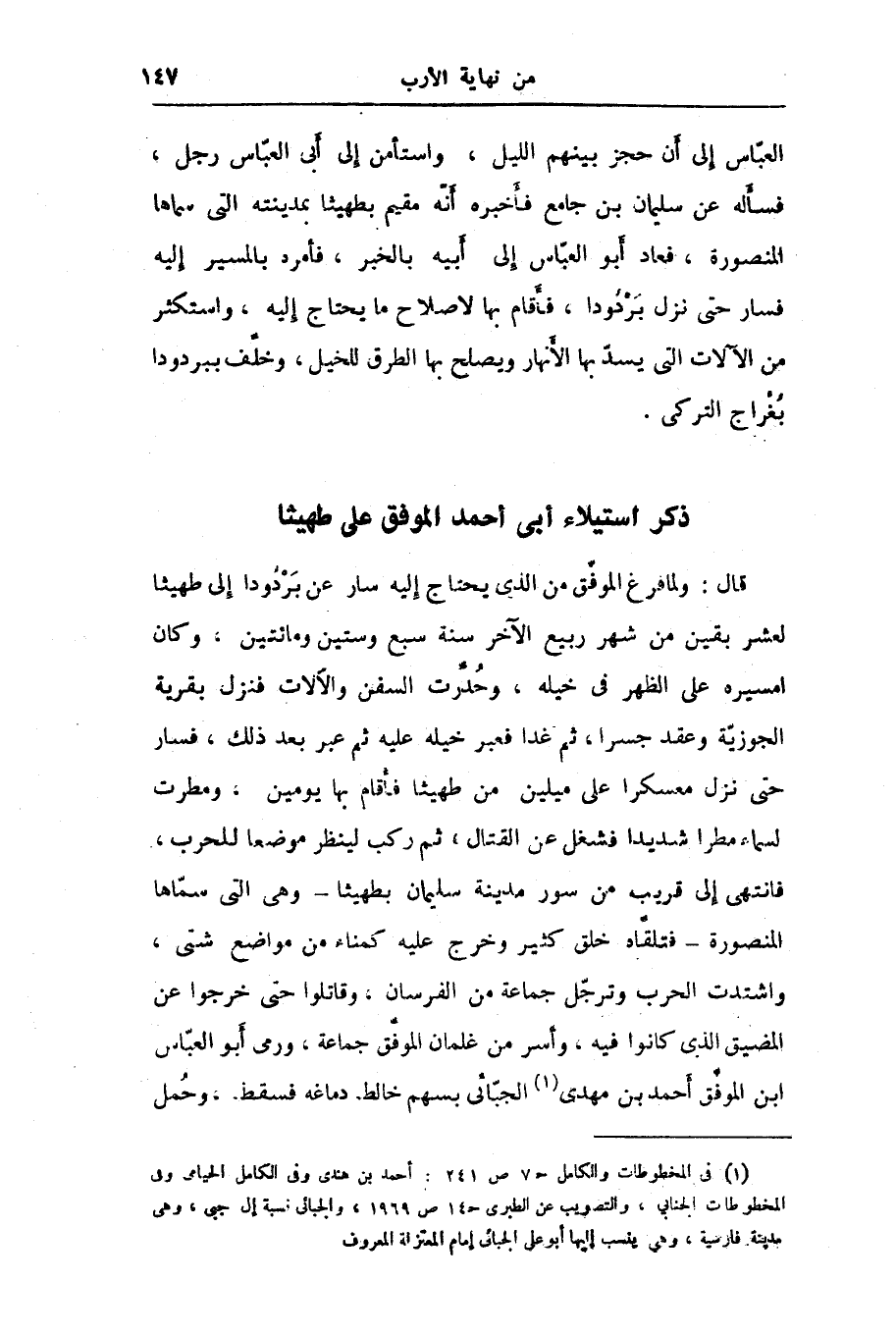 العبّاس إلى أن حجز بينهم الليل، واستأمن إلى أبى العبّاس رجل، فسأله عن سليمان بن جامع فأخبره أنّه مقيم بطهيثا بمدينته التى سماها المنصورة، فعاد أبو العبّاس إلى أبيه بالخبر، فأمره بالمسير إليه فسار حتى نزل بردوا، فأقام بها لاصلاح ما يحتاج إليه، واستكثر من الآلات التى يسدّ بها الأنهار ويصلح بها الطرق للخيل، وخلّف ببردودا بغراج التركى.