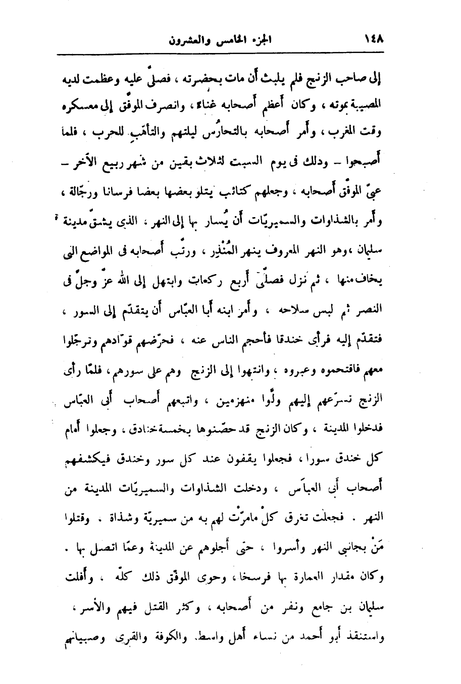 إلى صاحب الزنج فلم يلبث أن مات بحضرته، فصلّى عليه وعظمت لديه المصيبة بموته، وكان أعظم أصحابه غناء، وانصرف الموفّق إلى معسكره وقت المغرب، وأمر أصحابه بالتحارس ليلتهم والتأهّب للحرب، فلما أصبحوا- وذلك في يوم السبت لثلاث بقين من شهر ربيع الآخر- عبىّ الموفّق أصحابه، وجعلهم كتائب يتلو بعضها بعضا فرسانا ورجّالة، وأمر بالشذاوات والسميريّات أن يسار بها إلى النهر، الذى يشقّ مدينة سليمان، وهو النهر المعروف ينهر المنذر، ورتّب أصحابه في المواضع التى يخاف منها، ثم نزل فصلّى أربع ركعات وابتهل إلى الله عزّ وجلّ في النصر ثم لبس سلاحه، وأمر ابنه أبا العبّاس أن يتقدّم إلى السور، فتقدّم إليه فرأى خندقا فأحجم الناس عنه، فحرّضهم قوّادهم وترجّلوا معهم فاقتحموه وعبروه، وانتهوا إلى الزنج وهم على سورهم، فلمّا رأى الزنج تسرّعهم إليهم ولّوا منهزمين، واتبعهم أصحاب أبى العبّاس فدخلوا المدينة، وكان الزنج قد حصّنوها بخمسة خنادق، وجعلوا أمام كل خندق سورا، فجعلوا يقفون عند كل سور وخندق فيكشفهم أصحاب أبى العبّاس، ودخلت الشذاوات والسميريّات المدينة من النهر. فجعلت تغرق كل ما مرّت لهم به من سميريّة وشذاة، وقتلوا من بجانبى النهر وأسروا، حتى أجلوهم عن المدينة وعمّا اتصل بها، وكان مقدار العمارة بها فرسخا، وحوى الموفّق ذلك كلّه، وأفلت سليمان بن جامع ونفر من أصحابه، وكثر القتل فيهم والأسر، واستنقذ أبو أحمد من نساء أهل واسط والكوفة والقرى وصبيانهم