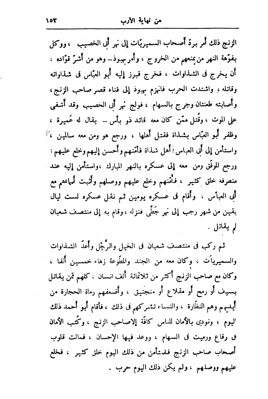الزنج ذلك أمر بردّ أصحاب السميريّات إلى نهر أبى الخصيب، ووكل بفوّهة النهر من يمنعهم من الخروج، وأمر بهبوذ- وهو من أشرّ قوّاده، أن يخرج في الشذاوات، فخرج فبرز إليه أبو العبّاس في شذاواته وقاتله، واشتدت الحرب فانهزم بهبوذ إلى فناء قصر صاحب الزنج، وأصابته طعنتان وجرح بالسهام، فولج نهر أبى الخصيب وقد أشفى على الموت، وقتل ممّن كان معه قائد ذو بأس- يقال له عميرة، وظفر أبو العبّاس بشذاة فقتل أهلها، ورجع هو ومن معه سالمين، واستأمن إلى أبى العباس أهل شذاة فأمّنهم وأحسن إليهم وخلع عليهم، ورجع الموفّق ومن معه إلى عسكره بالنهر المبارك، واستأمن إليه عند منصرفه خلق كثير، فأمّنهم وخلع عليهم ووصلهم وأثبت أسماءهم مع أبى العبّاس، وأقام في عسكره يومين ثم نقل عسكره لست ليال بقين من شهر رجب إلى نهر جطّى فنزله، وقام به إلى منتصف شعبان لم يقاتل.