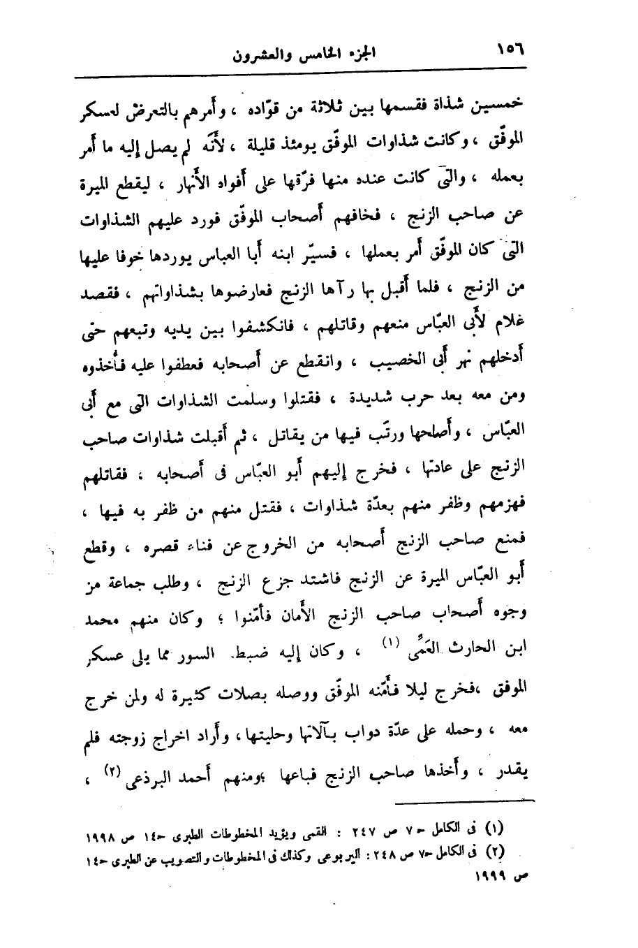 خمسين شذاة فقسمها بين ثلاثة من قوّاده، وأمرهم بالتعرض لعسكر الموفّق، وكانت شذاوات الموفّق يومئذ قليلة، لأنّه لم يصل إليه ما أمر بعمله، والتى كانت عنده منها فرّقها على أفواه الأنهار، ليقطع الميرة عن صاحب الزنج، فخافهم أصحاب الموفّق فورد عليهم الشذاوات التى كان الموفّق أمر بعملها، فسيّر ابنه أبا العباس يوردها خوفا عليها من الزنج، فلما أقبل بها رآها الزنج فعارضوها بشذاواتهم، فقصد غلام لأبى العبّاس منعهم وقاتلهم، فانكشفوا بين يديه وتبعهم حتى أدخلهم نهر أبى الخصيب، وانقطع عن أصحابه فعطفوا عليه فأخذوه ومن معه بعد حرب شديدة، فقتلوا وسلمت الشذاوات التى مع أبى العبّاس، وأصلحها ورتّب فيها من يقاتل، ثم أقبلت شذاوات صاحب الزنج على عادتها، فخرج إليهم أبو العبّاس في أصحابه، فقاتلهم فهزمهم وظفر منهم بعدّة شذاوات، فقتل منهم من ظفر به فيها، فمنع صاحب الزنج أصحابه من الخروج عن فناء قصره، وقطع أبو العبّاس الميرة عن الزنج فاشتد جزع الزنج، وطلب جماعة من وجوه أصحاب صاحب الزنج الأمان فأمّنوا؛ وكان منهم محمد ابن الحارث العمّى «1» ، وكان إليه ضبط السور مما يلى عسكر الموفق، فخرج ليلا فأمّنه الموفّق ووصله بصلات كثيرة له ولمن خرج معه، وحمله على عدّة دواب بآلاتها وحليتها، وأراد اخراج زوجته فلم يقدر، وأخذها صاحب الزنج فباعها؛ ومنهم أحمد البرذعى «2» ،