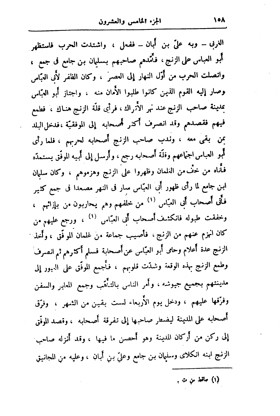 الغربى- وبه علىّ بن أبان- ففعل، واشتدت الحرب فاستظهر أبو العباس على الزنج، فأمّدهم صاحبهم بسليمان بن جامع في جمع، واتصلت الحرب من أوّل النهار إلى العصر، وكان الظفر لأبى العبّاس وصار إليه القوم الذين كانوا طلبوا الأمان منه، واجتاز أبو العبّاس بمدينة صاحب الزنج عند نهر الأتراك، فرأى قلّة الزنج هناك، فطمع فيهم فقصدهم وقد انصرف أكثر أصحابه إلى الموفقيّة، فدخل البلد بمن بقى معه، وندب صاحب الزنج أصحابه لحربهم، فلما رأى أبو العباس اجتماعهم وقلّة أصحابه رجع، وأرسل إلى أبيه الموفّق يستمدّه فأتاه من خف من الغلمان وظهروا على الزنج وهزموهم، وكان سليمان ابن جامع لما رأى ظهور أبى العبّاس سار في النهر مصعدا في جمع كثير فأتى أصحاب أبى العبّاس «1» من خلفهم وهم يحاربون من بإزائهم، وخفقت طبوله فانكشف أصحاب أبى العبّاس «2» ، ورجع عليهم من كان انهزم عنهم من الزنج، فأصيب جماعة من غلمان الموفّق، وأخذ الزنج عدة أعلام وحامى أبو العبّاس عن أصحابة فسلم أكثرهم ثم انصرف وطمع الزنج بهذه الوقعة وشدّت قلوبهم، فأجمع الموفّق على العبور إلى مدينتهم بجميع جيوشه، وأمر الناس بالتأهّب وجمع المعابر والسفن وفرّقها عليهم، ودخل يوم الأربعاء لست بقين من الشهر، وفرّق أصحابه على المدينة ليضطر صاحبها إلى تفرقة أصحابه، وقصد الموفّق إلى ركن من أركان المدينة وهو أحصن ما فيها، وقد أنزله صاحب الزنج ابنه انكلاى وسليمان بن جامع وعلىّ بن أبان، وعليه من المجانيق