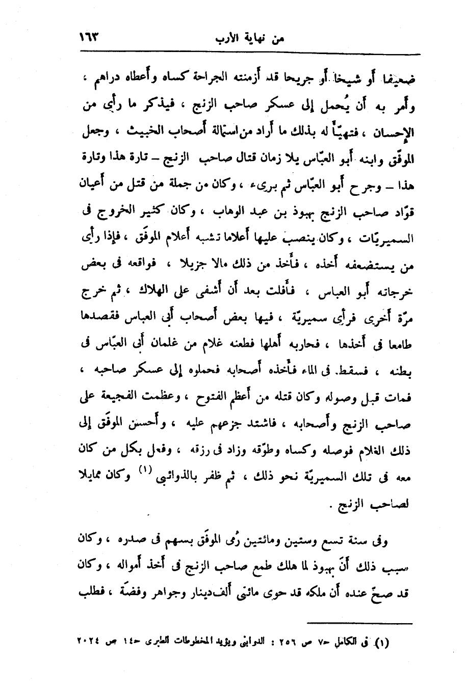 ضعيفا أو شيخا أو جريحا قد أزمنته الجراحة كساه وأعطاه دراهم، وأمر به أن يحمل إلى عسكر صاحب الزنج، فيذكر ما رأى من الإحسان، فتهيّأ له بذلك ما أراد من استمالة أصحاب الخبيث، وجعل الموفّق وابنه أبو العبّاس يلازمان قتال صاحب الزنج- تارة هذا وتارة هذا- وجرح أبو العبّاس ثم برىء، وكان من جملة من قتل من أعيان قوّاد صاحب الزنج بهبوذ بن عبد الوهاب، وكان كثير الخروج في السميريّات، وكان ينصب عليها أعلاما تشبه أعلام الموفّق، فإذا رأى من يستضعفه أخذه، فأخذ من ذلك ما لا جزيلا، فواقعه في بعض خرجاته أبو العباس، فأفلت بعد أن أشفى على الهلاك، ثم خرج مرّة أخرى فرأى سميريّة، فيها بعض أصحاب أبى العباس فقصدها طامعا في أخذها، فحاربه أهلها فطعنه غلام من غلمان أبى العبّاس في بطنه، فسقط في الماء فأخذه أصحابه فحملوه إلى عسكر صاحبه، فمات قبل وصوله وكان قتله من أعظم الفتوح، وعظمت الفجيعة على صاحب الزنج وأصحابه، فاشتد جزعهم عليه، وأحسن الموفّق إلى ذلك الغلام فوصله وكساه وطوّقه وزاد في رزقه، وفعل بكل من كان معه في تلك السميريّة نحو ذلك، ثم ظفر بالذوائبى «1» وكان ممايلا لصاحب الزنج.