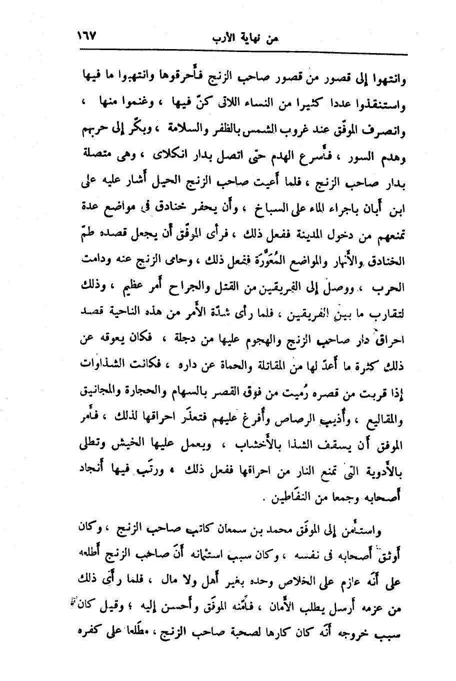 وانتهوا إلى قصور من قصور صاحب الزنج فأحرقوها وانتهبوا ما فيها واستنقذوا عددا كثيرا من النساء اللاتى كنّ فيها، وغنموا منها، وانصرف الموفّق عند غروب الشمس بالظفر والسلامة، وبكّر إلى حربهم وهدم السور، فأسرع الهدم حتى اتصل بدار انكلاى، وهى متصلة بدار صاحب الزنج، فلما أعيت صاحب الزنج الحيل أشار عليه على ابن أبان باجراء الماء على السباخ، وأن يحفر خنادق في مواضع عدة تمنعهم من دخول المدينة ففعل ذلك، فرأى الموفّق أن يجعل قصده طمّ الخنادق والأنهار والمواضع المعوّرة ففعل ذلك، وحامى الزنج عنه ودامت الحرب، ووصل إلى الفريقين من القتل والجراح أمر عظيم، وذلك لتقارب ما بين الفريقين، فلما رأى شدّة الأمر من هذه الناحية قصد احراق دار صاحب الزنج والهجوم عليها من دجلة، فكان يعوقه عن ذلك كثرة ما أعدّ لها من المقاتلة والحماة عن داره، فكانت الشذاوات إذا قربت من قصره رميت من فوق القصر بالسهام والحجارة والمجانيق والمقاليع، وأذيب الرصاص وأفرغ عليهم فتعذّر احراقها لذلك، فأمر الموفّق أن يسقف الشذا بالأخشاب، ويعمل عليها الخيش وتطلى بالأدوية التى تمنع النار من احراقها ففعل ذلك، ورتّب فيها أنجاد أصحابه وجمعا من النفّاطين.