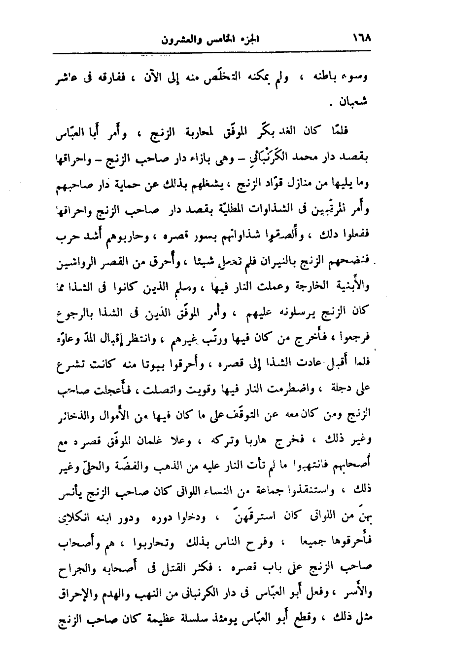 فلمّا كان الغد بكّر الموفّق لمحاربة الزنج، وأمر أبا العبّاس بقصد دار محمد الكرنبائى- وهى بازاء دار صاحب الزنج- واحراقها وما يليها من منازل قوّاد الزنج، يشغلهم بذلك عن حماية دار صاحبهم وأمر المرّتين في الشذاوات المطليّة بقصد دار صاحب الزنج واحراقها ففعلوا ذلك، وألصقوا شذاواتهم بسور قصره، وحاربوهم أشد حرب فنضحهم الزنج بالنيران فلم تعمل شيئا، وأحرق من القصر الرواشين والأبنية الخارجة وعملت النار فيها، وسلم الذين كانوا في الشذا مما كان الزنج يرسلونه عليهم، وأمر الموفّق الذين في الشذا بالرجوع فرجعوا، فأخرج من كان فيها ورتّب غيرهم، وانتظر إقبال المدّ وعلوّه فلما أقبل عادت الشذا إلى قصره، وأحرقوا بيوتا منه كانت تشرع على دجلة، واضطرمت النار فيها وقويت واتصلت، فأعجلت صاحب الزنج ومن كان معه عن التوقّف على ما كان فيها من الأموال والذخائر وغير ذلك، فخرج هاربا وتركه، وعلا غلمان الموفّق قصره مع أصحابهم فانتهبوا ما لم تأت النار عليه من الذهب والفضّة والحلىّ وغير ذلك، واستنقذوا جماعة من النساء اللواتى كان صاحب الزنج يأنس بهنّ من اللواتى كان استرقّهنّ، ودخلوا دوره ودور ابنه انكلاى فأحرقوها جميعا، وفرح الناس بذلك وتحاربوا، هم وأصحاب صاحب الزنج على باب قصره، فكثر القتل في أصحابه والجراح والأسر، وفعل أبو العبّاس في دار الكرنبائى من النهب والهدم والإحراق مثل ذلك، وقطع أبو العبّاس يومئذ سلسلة عظيمة كان صاحب الزنج