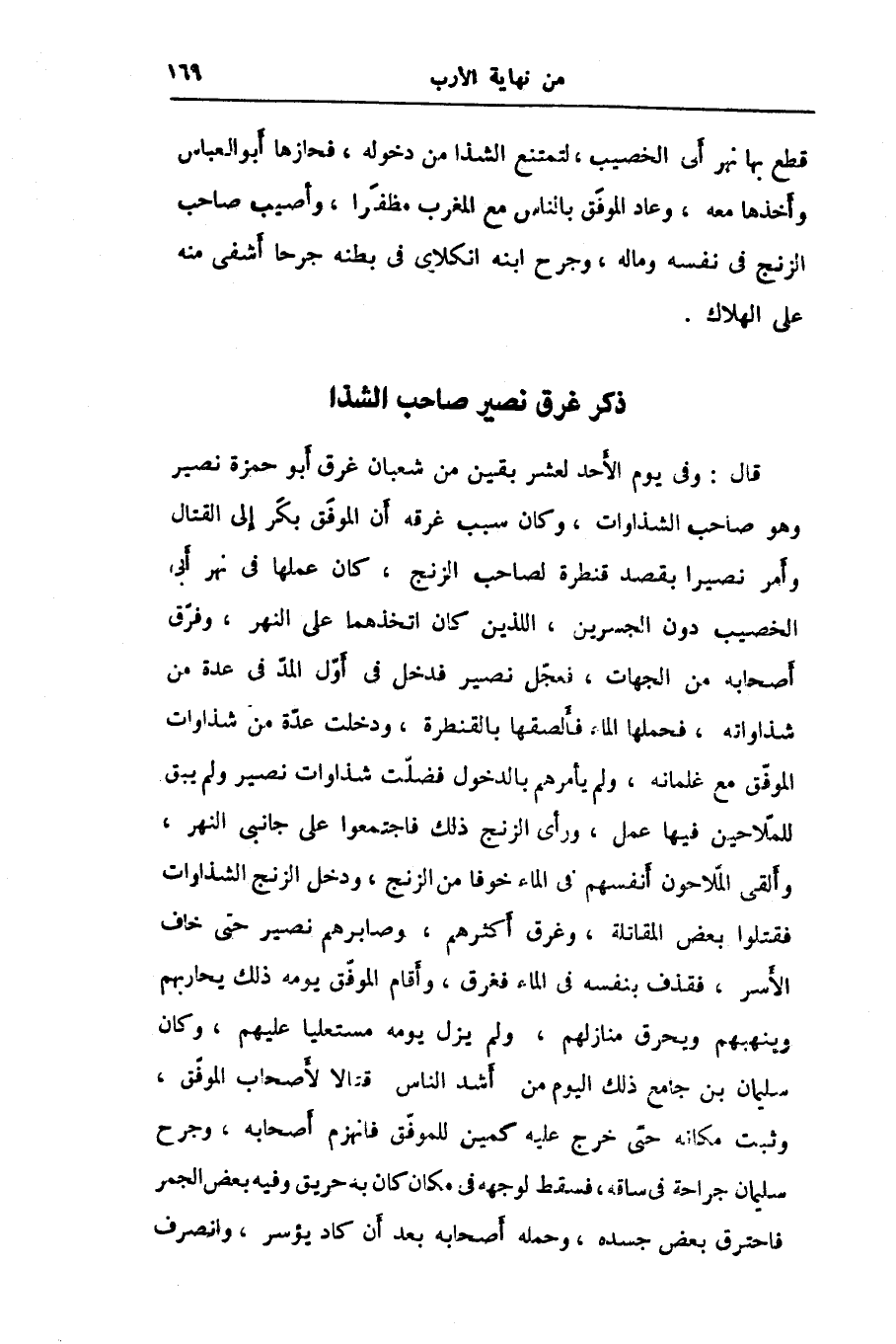 قال: وفي يوم الأحد لعشر بقين من شعبان غرق أبو حمزة نصير وهو صاحب الشذاوات، وكان سبب غرقه أن الموفّق بكّر إلى القتال وأمر نصيرا بقصد قنطرة لصاحب الزنج، كان عملها في نهر أبى الخصيب دون الجسرين، اللذين كان اتخذهما على النهر، وفرّق أصحابه من الجهات، فعجّل نصير فدخل في أوّل المدّ في عدة من شذاواته، فحملها الماء فألصقها بالقنطرة، ودخلت عدّة من شذاوات الموفّق مع غلمانه، ولم يأمرهم بالدخول فضلّت شذاوات نصير ولم يبق للملّاحين فيها عمل، ورأى الزنج ذلك فاجتمعوا على جانبى النهر، وألقى الملّاحون أنفسهم في الماء خوفا من الزنج، ودخل الزنج الشذاوات فقتلوا بعض المقاتلة، وغرق أكثرهم، وصابرهم نصير حتى خاف الأسر، فقذف بنفسه في الماء فغرق، وأقام الموفّق يومه ذلك يحاربهم وينهبهم ويحرق منازلهم، ولم يزل يومه مستعليا عليهم، وكان سليمان بن جامع ذلك اليوم من أشد الناس قتالا لأصحاب الموفّق، وثبت مكانه حتى خرج عليه كمين للموفّق فانهزم أصحابه، وجرح سليمان جراحة في ساقه، فسقط لوجهه في مكان كان به حريق وفيه بعض الجمر فاحترق بعض جسده، وحمله أصحابه بعد أن كاد يؤسر، وانصرف