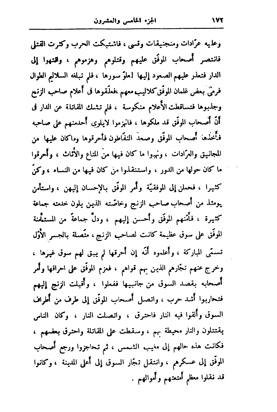وعليه عرّادات ومنجنيقات وقسى، فاشتبكت الحرب وكثرت القتلى فانتصر أصحاب الموفّق عليهم وقتلوهم وهزموهم، وانتهوا إلى الدار فتعذر عليهم الصعود إليها لعلوّ سورها، فلم تبلغه السلاليم الطوال فرمى بعض غلمان الموفّق كلاليب معهم، فعلّقوها في أعلام صاحب الزنج وجذبوها فتساقطت الأعلام منكوسة، فلم تشك المقاتلة عن الدار في أنّ أصحاب الموفّق قد ملكوها، فانهزموا لا يلوى أحد منهم على صاحبه فأخذها أصحاب الموفّق وصعد النفّاطون فأحرقوها وما كان عليها من المجانيق والعرّادات، ونهبوا ما كان فيها من المتاع والأثاث، وأحرقوا ما كان حولها من الدور، واستنقذوا من كان فيها من النساء، وكنّ كثيرا، فحملن إلى الموفقيّة وأمر الموفّق بالإحسان إليهن، واستأمن يومئذ من أصحاب صاحب الزنج وخاصّته الذين يلون خدمته جماعة كثيرة، فأمّنهم الموفّق وأحسن إليهم، ودلّ جماعة من المستأمنة الموفّق على سوق عظيمة كانت لصاحب الزنج، متّصلة بالجسر الأوّل تسمّى المباركة، وأعلموه أنّه إن أحرقها لم يبق لهم سوق غيرها، وخرج عنهم تجّارهم الذين بهم قواهم، فعزم الموفّق على احراقها وأمر أصحابه بقصد السوق من جانبيها ففعلوا، وأقبلت الزنج إليهم فتحاربوا أشد حرب، واتصل أصحاب الموفّق إلى طرف من أطراف السوق وألقوا فيه النار فاحترق، واتصلت النار، وكان الناس يقتتلون والنار محيطة بهم، وسقطت على المقاتلة واحترق بعضهم، فكانت هذه حالهم إلى مغيب الشمس، ثم تحاجزوا ورجع أصحاب الموفّق إلى عسكرهم، وانتقل تجّار السوق إلى أعلى المدينة، وكانوا قد نقلوا معظم أمتعتهم وأموالهم.