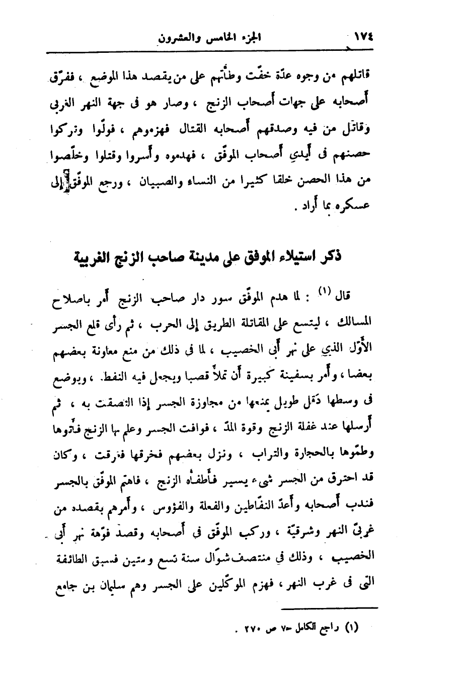 قال «1» : لما هدم الموفّق سور دار صاحب الزنج أمر باصلاح المسالك، ليتسع على المقاتلة الطريق إلى الحرب، ثم رأى قلع الجسر الأوّل الذى على نهر أبى الخصيب، لما في ذلك من منع معاونة بعضهم بعضا، وأمر بسفينة كبيرة أن تملأ قصبا ويجعل فيه النفط، ويوضع فى وسطها دقل طويل يمنعها من مجاوزة الجسر إذا التصقت به، ثم أرسلها عند غفلة الزنج وقوة المدّ، فوافت الجسر وعلم بها الزنج فأتوها وطمّوها بالحجارة والتراب، ونزل بعضهم فخرقها فغرقت، وكان قد احترق من الجسر شىء يسير فأطفأه الزنج، فاهتم الموفّق بالجسر فندب أصحابه وأعدّ النفّاطين والفعلة والفؤوس، وأمرهم بقصده من غربىّ النهر وشرقيّة، وركب الموفّق في أصحابه وقصد فوّهة نهر أبى الخصيب، وذلك في منتصف شوّال سنة تسع وستين فسبق الطائفة التى في غرب النهر، فهزم الموكّلين على الجسر وهم سليمان بن جامع