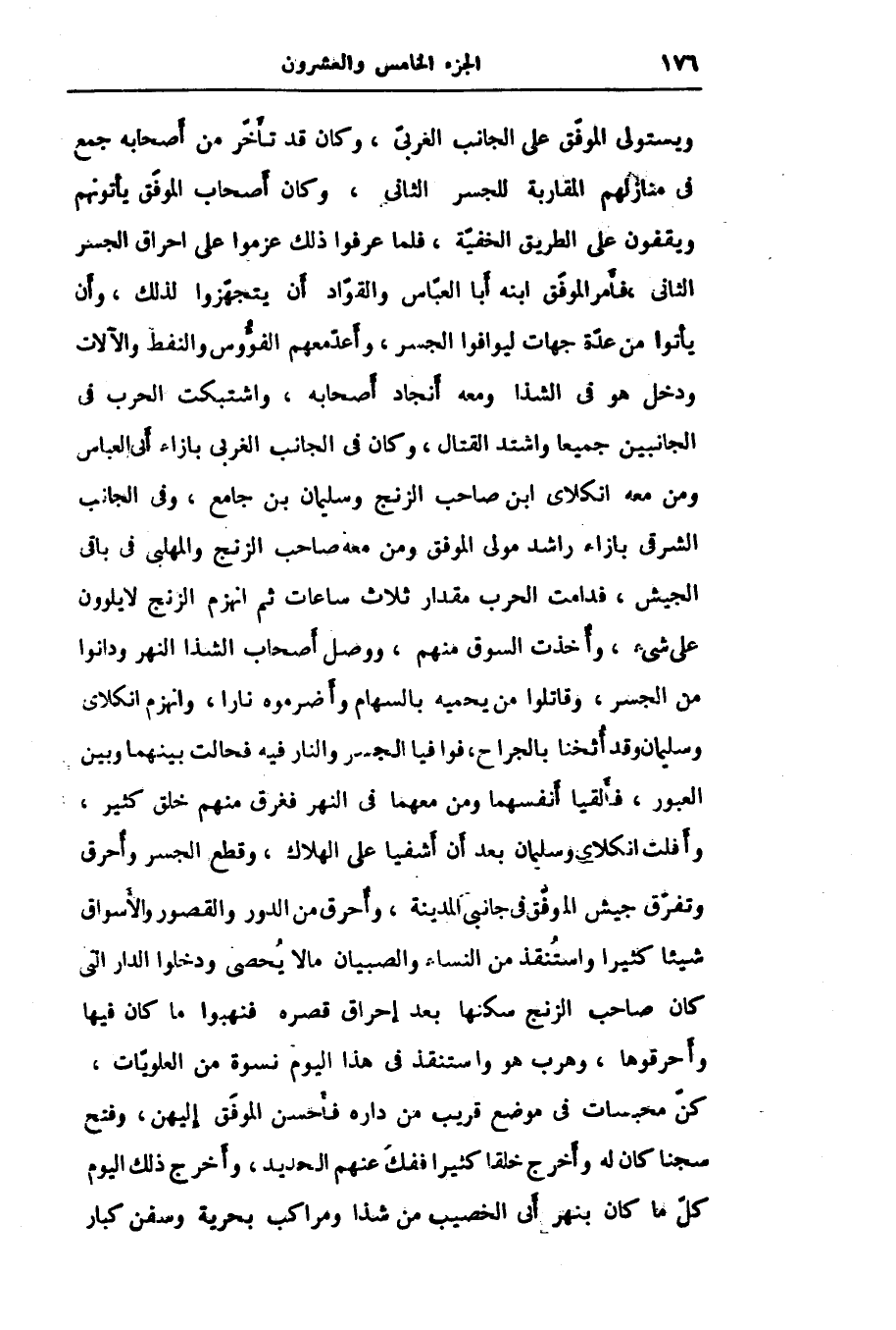 ويستولى الموفّق على الجانب الغربىّ، وكان قد تأخّر من أصحابه جمع فى منازلهم المقاربة للجسر الثانى، وكان أصحاب الموفّق يأتونهم ويقفون على الطريق الخفيّة، فلما عرفوا ذلك عزموا على احراق الجسر الثانى، فأمر الموفّق ابنه أبا العبّاس والقوّاد أن يتجهّزوا لذلك، وأن يأتوا من عدّة جهات ليوافوا الجسر، وأعدّ معهم الفؤوس والنفط والآلات ودخل هو في الشذا ومعه أنجاد أصحابه، واشتبكت الحرب في الجانبين جميعا واشتد القتال، وكان في الجانب الغربى بازاء أبى العباس ومن معه انكلاى ابن صاحب الزنج وسليمان بن جامع، وفي الجانب الشرقى بازاء راشد مولى الموفّق ومن معه صاحب الزنج والمهلبى في باقى الجيش، فدامت الحرب مقدار ثلاث ساعات ثم انهزم الزنج لا يلوون على شىء، وأخذت السوق منهم، ووصل أصحاب الشذا النهر ودانوا من الجسر، وقاتلوا من يحميه بالسهام وأضرموه نارا، وانهزم انكلاى وسليمان وقد أثخنا بالجراح، فوافيا الجسر والنار فيه فحالت بينهما وبين العبور، فألقيا أنفسهما ومن معهما في النهر فغرق منهم خلق كثير، وأفلت انكلاى وسليمان بعد أن أشفيا على الهلاك، وقطع الجسر وأحرق وتفرّق جيش الموفّق في جانبى المدينة، وأحرق من الدور والقصور والأسواق شيئا كثيرا واستنقذ من النساء والصبيان ما لا يحصى ودخلوا الدار التى كان صاحب الزنج سكنها بعد إحراق قصره فنهبوا ما كان فيها وأحرقوها، وهرب هو واستنقذ في هذا اليوم نسوة من العلويّات، كنّ محبسات في موضع قريب من داره فأحسن الموفّق إليهن، وفتح سجنا كان له وأخرج خلقا كثيرا ففكّ عنهم الحديد، وأخرج ذلك اليوم كلّ ما كان بنهر أتى الخصيب من شذا ومراكب بحرية وسفن كبار
