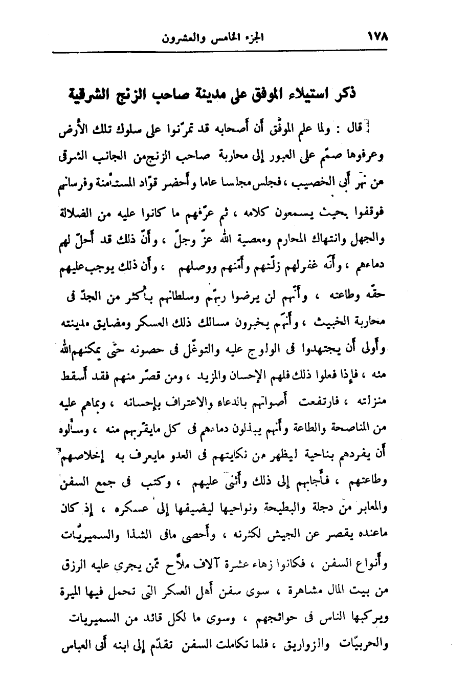 قال: ولما علم الموفّق أن أصحابه قد تمرّنوا على سلوك تلك الأرض وعرفوها صمّم على العبور إلى محاربة صاحب الزنج من الجانب الشرقى من نهر أبى الخصيب، فجلس مجلسا عاما وأحضر قوّاد المستأمنة وفرسانهم فوقفوا بحيث يسمعون كلامه، ثم عرّفهم ما كانوا عليه من الضلالة والجهل وانتهاك المحارم ومعصية الله عزّ وجلّ، وأنّ ذلك قد أحلّ لهم دماءهم، وأنّه غفر لهم زلّتهم وأمّنهم ووصلهم، وأن ذلك يوجب عليهم حقّه وطاعته، وأنّهم لن يرضوا ربّهم وسلطانهم بأكثر من الجدّ في محاربة الخبيث، وأنّهم يخبرون مسالك ذلك العسكر ومضايق مدينته وأولى أن يجتهدوا في الولوج عليه والتوغّل في حصونه حتى يمكنهم الله منه، فإذا فعلوا ذلك فلهم الإحسان والمزيد، ومن قصّر منهم فقد أسقط منزلته، فارتفعت أصواتهم بالدعاء والاعتراف بإحسانه، وبما هم عليه من المناصحة والطاعة وأنهم يبذلون دماءهم في كل ما يقرّبهم منه، وسألوه أن يفردهم بناحية ليظهر من نكايتهم في العدو ما يعرف به إخلاصهم وطاعتهم، فأجابهم إلى ذلك وأثنى عليهم، وكتب في جمع السفن والمعابر من دجلة والبطيحة ونواحيها ليضيفها إلى عسكره، إذ كان ما عنده يقصر عن الجيش لكثرته، وأحصى ما في الشذا والسميريّات وأنواع السفن، فكانوا زهاء عشرة آلاف ملّاح ممّن يجرى عليه الرزق من بيت المال مشاهرة، سوى سفن أهل العسكر التى تحمل فيها الميرة ويركبها الناس في حوائجهم، وسوى ما لكل قائد من السميريات والحربيّات والزواريق، فلما تكاملت السفن تقدّم إلى ابنه أبى العباس