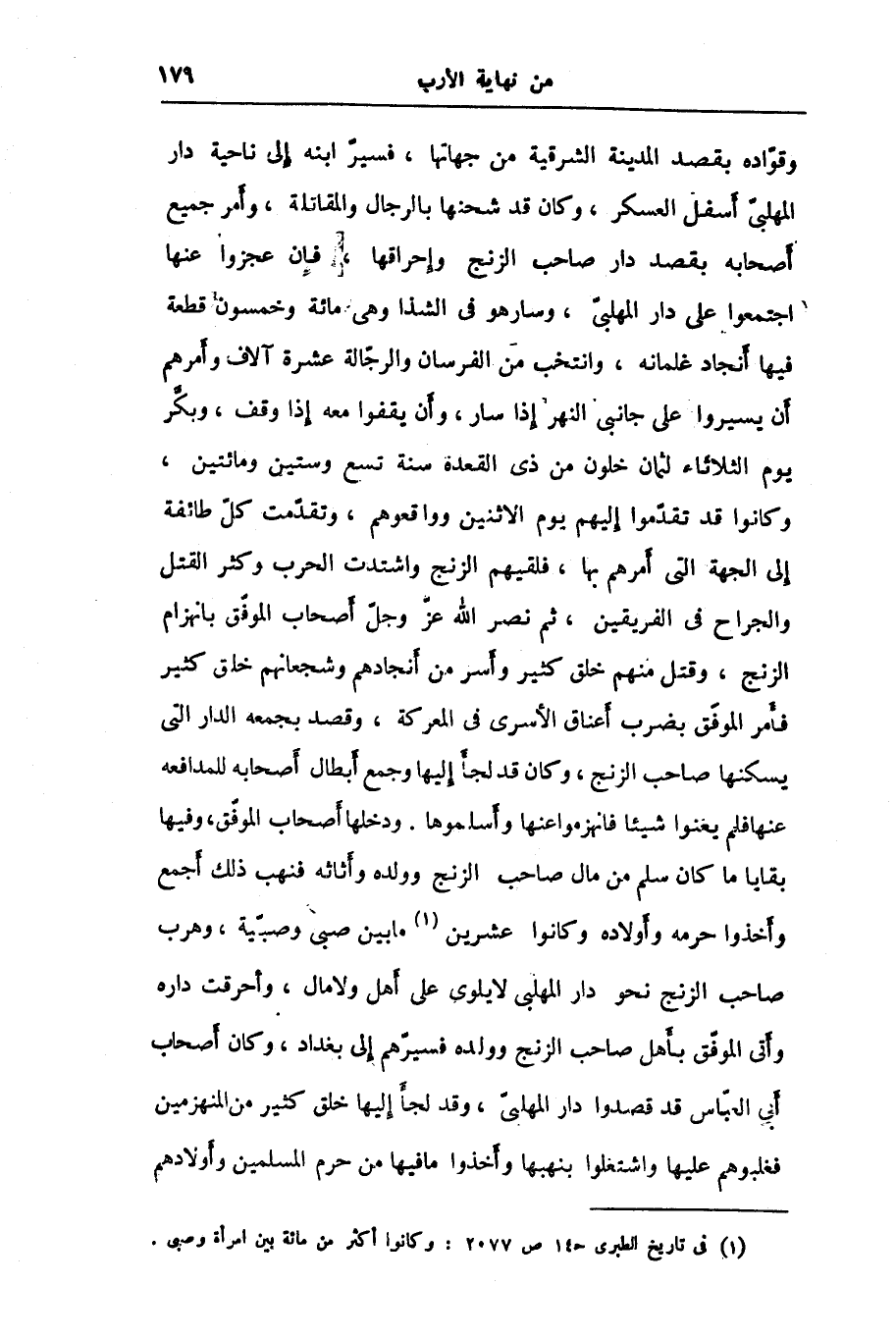 وقوّاده بقصد المدينة الشرقية من جهاتها، فسيّر ابنه إلى ناحية دار المهلبىّ أسفل العسكر، وكان قد شحنها بالرجال والمقاتلة، وأمر جميع أصحابه بقصد دار صاحب الزنج وإحراقها، فإن عجزوا عنها اجتمعوا على دار المهلبىّ، وسارهو في الشذا وهى مائة وخمسون قطعة فيها أنجاد غلمانه، وانتخب من الفرسان والرجّالة عشرة آلاف وأمرهم أن يسيروا على جانبى النهر إذا سار، وأن يقفوا معه إذا وقف، وبكّر يوم الثلاثاء لثمان خلون من ذى القعدة سنة تسع وستين ومائتين، وكانوا قد تقدّموا إليهم يوم الاثنين وواقعوهم، وتقدّمت كلّ طائفة إلى الجهة التى أمرهم بها، فلقيهم الزنج واشتدت الحرب وكثر القتل والجراح في الفريقين، ثم نصر الله عزّ وجلّ أصحاب الموفّق بانهزام الزنج، وقتل منهم خلق كثير وأسر من أنجادهم وشجعانهم خلق كثير فأمر الموفّق بضرب أعناق الأسرى في المعركة، وقصد بجمعه الدار التى يسكنها صاحب الزنج، وكان قد لجأ إليها وجمع أبطال أصحابه للمدافعه عنها فلم يغنوا شيئا فانهزموا عنها وأسلموها. ودخلها أصحاب الموفّق، وفيها بقايا ما كان سلم من مال صاحب الزنج وولده وأثاثه فنهب ذلك أجمع وأخذوا حرمه وأولاده وكانوا عشرين «1» ما بين صبى وصبيّة، وهرب صاحب الزنج نحو دار المهلبى لا يلوى على أهل ولا مال، وأحرقت داره وأتى الموفّق بأهل صاحب الزنج وولده فسيّرهم إلى بغداد، وكان أصحاب أبى العبّاس قد قصدوا دار المهلبىّ، وقد لجأ إليها خلق كثير من المنهزمين فغلبوهم عليها واشتغلوا بنهبها وأخذوا ما فيها من حرم المسلمين وأولادهم