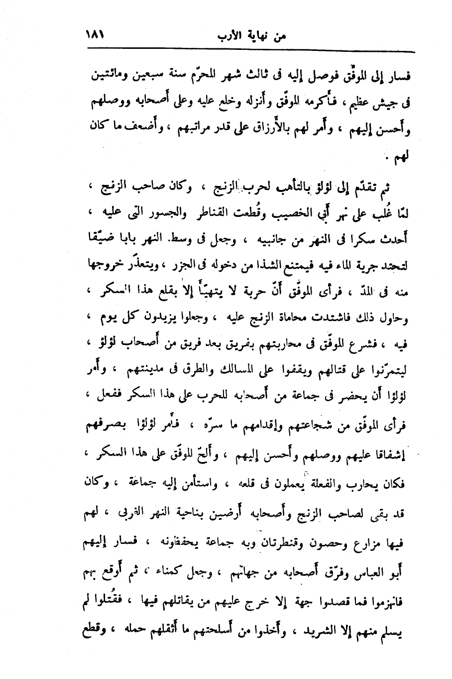 ثم تقدّم إلى لؤلؤ بالتأهب لحرب الزنج، وكان صاحب الزنج، لمّا غلب على نهر أبى الخصيب وقطعت القناطر والجسور التى عليه، أحدث سكرا في النهر من جانبيه، وجعل في وسط النهر بابا ضيّقا لتحتد جرية الماء فيه فيمتنع الشذا من دخوله في الجزر، ويتعذّر خروجها منه في المدّ، فرأى الموفّق أنّ حربة لا يتهيّأ إلا بقلع هذا السكر، وحاول ذلك فاشتدت محاماة الزنج عليه، وجعلوا يزيدون كل يوم، فيه، فشرع الموفّق في محاربتهم بفريق بعد فريق من أصحاب لؤلؤ، ليتمرّنوا على قتالهم ويقفوا على المسالك والطرق في مدينتهم، وأمر لؤلؤا أن يحضر في جماعة من أصحابه للحرب على هذا السكر ففعل، فرأى الموفّق من شجاعتهم وإقدامهم ما سرّه، فأمر لؤلؤا بصرفهم إشفاقا عليهم ووصلهم وأحسن إليهم، وألحّ الموفّق على هذا السكر، فكان يحارب والفعلة يعملون في قلعه، واستأمن إليه جماعة، وكان قد بقى لصاحب الزنج وأصحابه أرضين بناحية النهر الغربى، لهم فيها مزارع وحصون وقنطرتان وبه جماعة يحفظونه، فسار إليهم أبو العباس وفرّق أصحابه من جهاتهم، وجعل كمناء، ثم أوقع بهم فانهزموا فما قصدوا جهة إلا خرج عليهم من يقاتلهم فيها، فقتلوا لم يسلم منهم إلا الشريد، وأخذوا من أسلحتهم ما أثقلهم حمله، وقطع