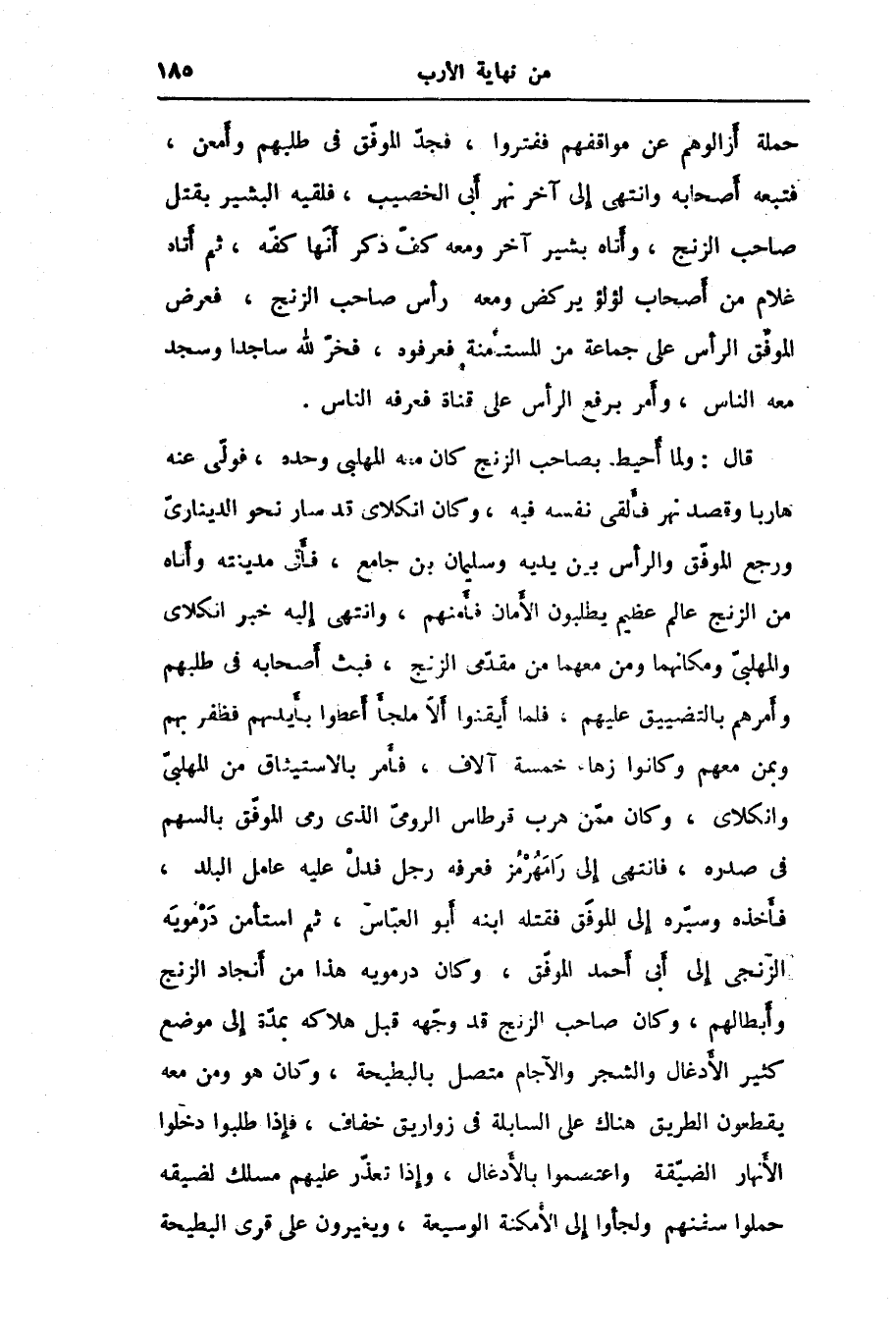 حملة أزالوهم عن مواقفهم ففتروا، فجدّ الموفّق في طلبهم وأمعن، فتبعه أصحابه وانتهى إلى آخر نهر أبى الخصيب، فلقيه البشير بقتل صاحب الزنج، وأتاه بشير آخر ومعه كفّ ذكر أنّها كفّه، ثم أتاه غلام من أصحاب لؤلؤ يركض ومعه رأس صاحب الزنج، فعرض الموفّق الرأس على جماعة من المستأمنة فعرفوه، فخرّ لله ساجدا وسجد معه الناس، وأمر برفع الرأس على قناة فعرفه الناس.