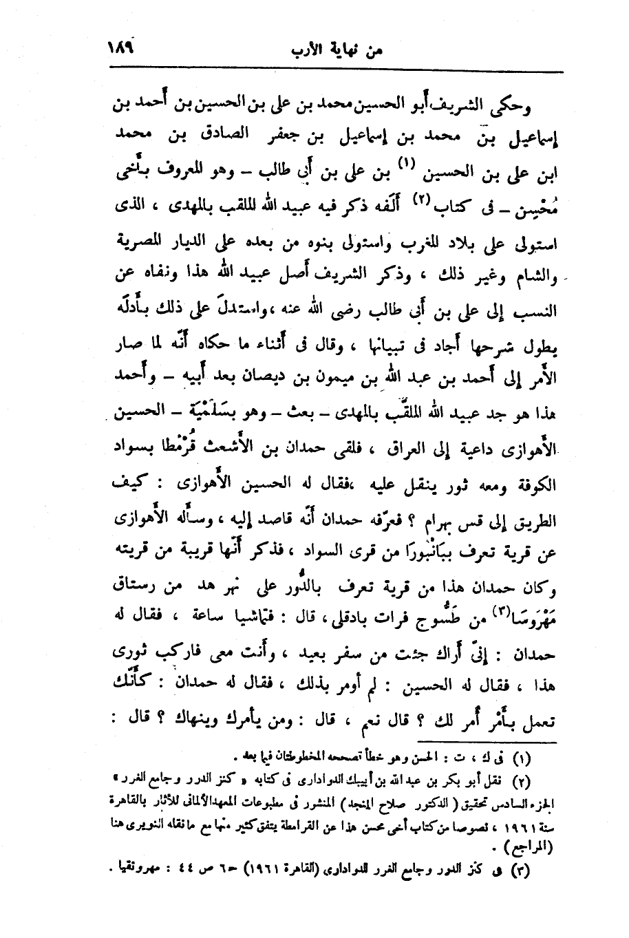 وحكى الشريف أبو الحسين محمد بن على بن الحسين بن أحمد بن إسماعيل بن محمد بن إسماعيل بن جعفر الصادق بن محمد ابن على بن الحسين «1» بن على بن أبى طالب- وهو المعروف بأخى محسن- فى كتاب «2» ألّفه ذكر فيه عبيد الله الملقب بالمهدى، الذى استولى على بلاد المغرب واستولى بنوه من بعده على الديار المصرية والشام وغير ذلك، وذكر الشريف أصل عبيد الله هذا ونفاه عن النسب إلى على بن أبى طالب رضى الله عنه، واستدلّ على ذلك بأدلّه يطول شرحها أجاد في تبيانها، وقال في أثناء ما حكاه أنّه لما صار الأمر إلى أحمد بن عبد الله بن ميمون بن ديصان بعد أبيه- وأحمد هذا هو جد عبيد الله الملقّب بالمهدى- بعث- وهو بسلمية- الحسين الأهوازى داعية إلى العراق، فلقى حمدان بن الأشعث قرمطا بسواد الكوفة ومعه ثور ينقل عليه، فقال له الحسين الأهوازى: كيف الطريق إلى قس بهرام؟ فعرّفه حمدان أنّه قاصد إليه، وسأله الأهوازى عن قرية تعرف ببانبورا من قرى السواد، فذكر أنّها قريبة من قريته وكان حمدان هذا من قرية تعرف بالدّور على نهر هد من رستاق مهروسا «3» من طسّوج فرات بادقلى، قال: فتماشيا ساعة، فقال له حمدان: إنّى أراك جئت من سفر بعيد، وأنت معى فاركب ثورى هذا، فقال له الحسين: لم أومر بذلك، فقال له حمدان: كأنّك تعمل بأمر أمر لك؟ قال نعم، قال: ومن يأمرك وينهاك؟ قال: