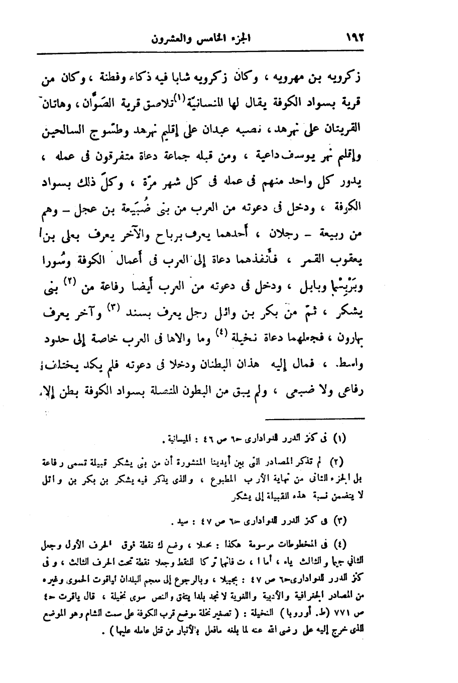 زكرويه بن مهرويه، وكان زكرويه شابا فيه ذكاء وفطنة، وكان من قرية بسواد الكوفة يقال لها المنسانيّة «1» تلاصق قرية الصوّان، وهاتان القريتان على نهرهد، نصبه عبدان على إقليم نهرهد وطسّوج السالحين وإقليم نهر يوسف داعية، ومن قبله جماعة دعاة متفرقون في عمله، يدور كل واحد منهم في عمله في كل شهر مرّة، وكلّ ذلك بسواد الكوفة، ودخل في دعوته من العرب من بنى ضبيعة بن عجل- وهم من ربيعة- رجلان، أحدهما يعرف برباح والآخر يعرف بعلى بن يعقوب القمر، فأنفذهما دعاة إلى العرب في أعمال الكوفة وسورا وبربسما وبابل، ودخل في دعوته من العرب أيضا رفاعة من «2» بنى يشكر، ثمّ من بكر بن وائل رجل يعرف بسند «3» وآخر يعرف بهارون، فجعلهما دعاة نخيلة «4» وما والاها في العرب خاصة إلى حدود واسط، فمال إليه هذان البطنان ودخلا في دعوته فلم يكد يختلف رفاعى ولا ضبعى، ولم يبق من البطون المتصلة بسواد الكوفة بطن إلا