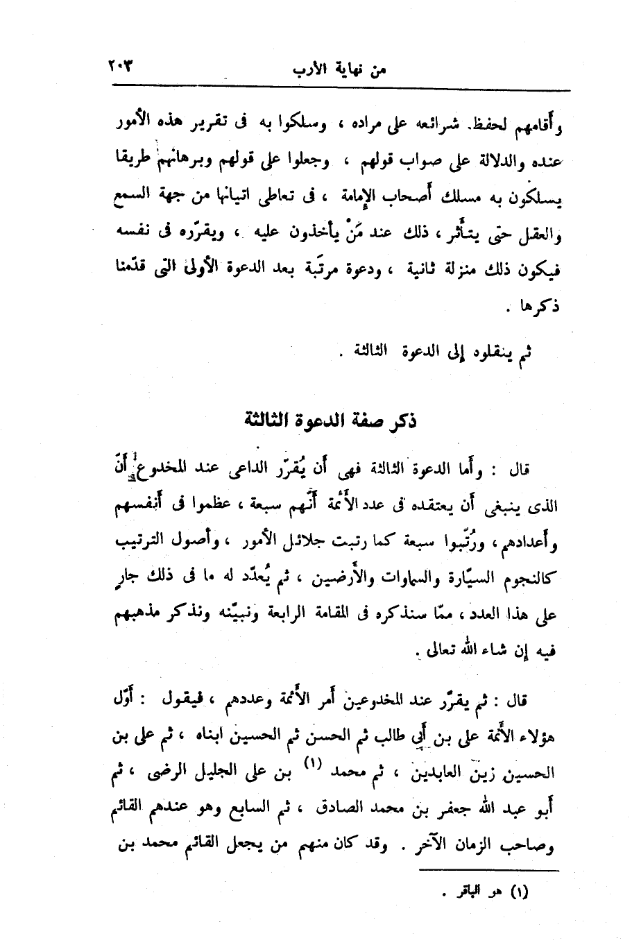 وأقامهم لحفظ شرائعه على مراده، وسلكوا به في تقرير هذه الأمور عنده والدلالة على صواب قولهم، وجعلوا على قولهم وبرهانهم طريقا يسلكون به مسلك أصحاب الإمامة، فى تعاطى اتيانها من جهة السمع والعقل حتى يتأثر، ذلك عند من يأخذون عليه، ويقرّره في نفسه فيكون ذلك منزلة ثانية، ودعوة مرتّبة بعد الدعوة الأولى التى قدّمنا ذكرها.