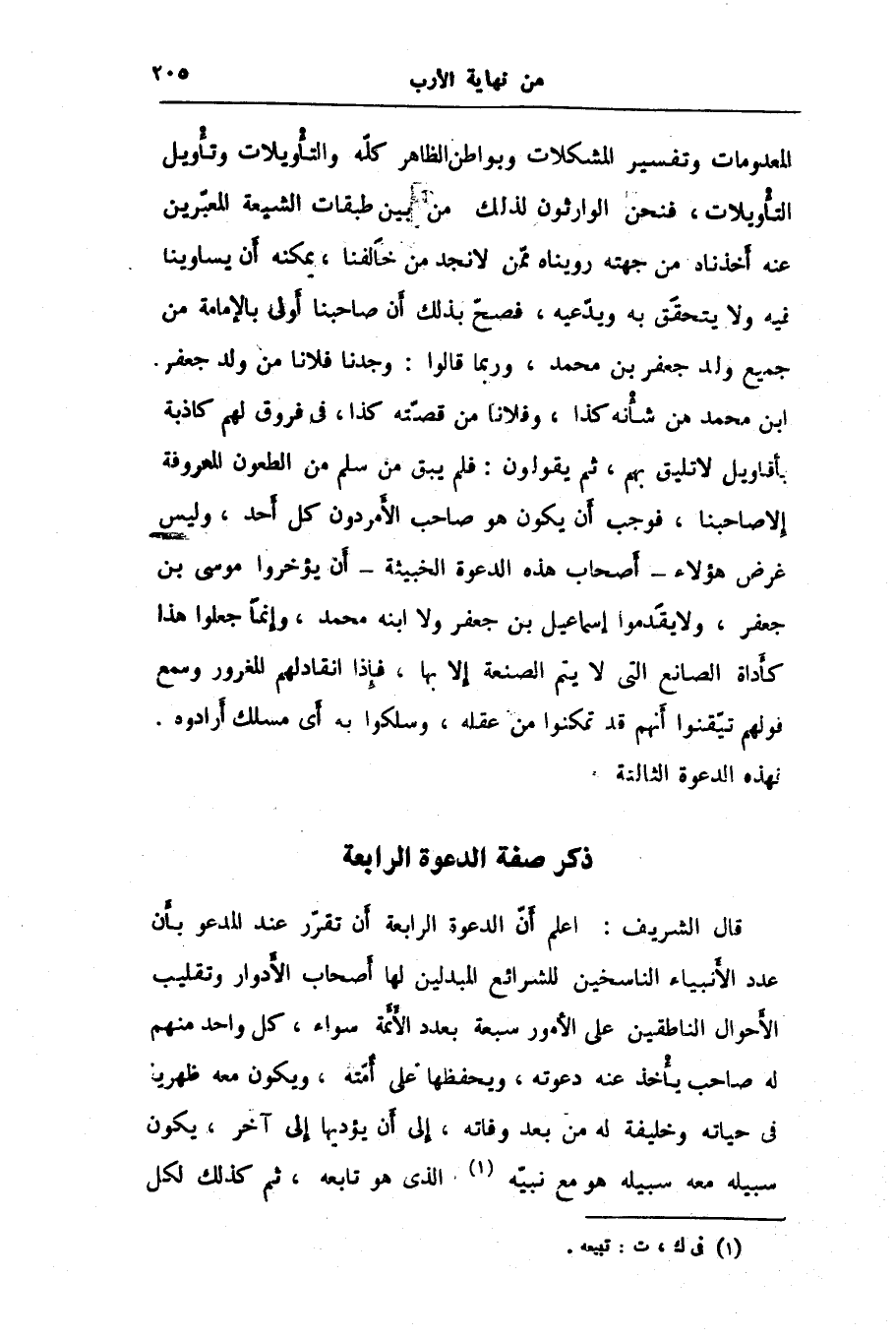 قال الشريف: اعلم أنّ الدعوة الرابعة أن تقرّر عند المدعو بأن عدد الأنبياء الناسخين للشرائع المبدلين لها أصحاب الأدوار وتقليب الأحوال الناطقين على الأمور سبعة بعدد الأئمة سواء، كل واحد منهم له صاحب يأخذ عنه دعوته، ويحفظها على أمّته، ويكون معه ظهريا فى حياته وخليفة له من بعد وفاته، إلى أن يؤديها إلى آخر، يكون سبيله معه سبيله هو مع نبيّه «1» الذى هو تابعه، ثم كذلك لكل