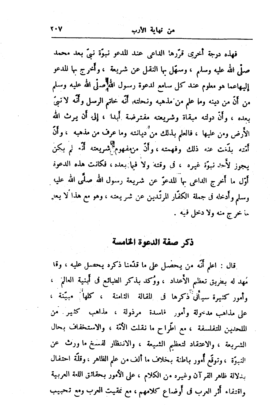 فهذه درجة أخرى قرّرها الداعى عند المدعو نبوّة نبىّ بعد محمد صلى الله عليه وسلم، وسهّل بها النقل عن شريعة، وأخرج بها المدعو إليها عما هو معلوم عند كل سامع لدعوة رسول الله صلى الله عليه وسلم من أنّ من دينه وما علم من مذهبه ونحلته أنّه خاتم الرسل وأنّه لا نبىّ بعده، وأنّ دولته مبقاة وشريعته مفترضة أبدا، إلى أن يرث الله الأرض ومن عليها، فالعلم بذلك من ديانته وما عرف من مذهبه، وأنّ أمّته بلّغت عنه ذلك وفهمته، وأنّ من مفهوم شريعته أنّه لم يكن يجوز لأحد نبوّة غيره، فى وقته ولا فيما بعده، فكانت هذه الدعوة أوّل ما أخرج الداعى بها المدعوّ عن شريعة رسول الله صلى الله عليه وسلم وأدخله في جملة الكفّار المرتدّين عن شريعته، وهو مع هذا لا يعد؟؟؟