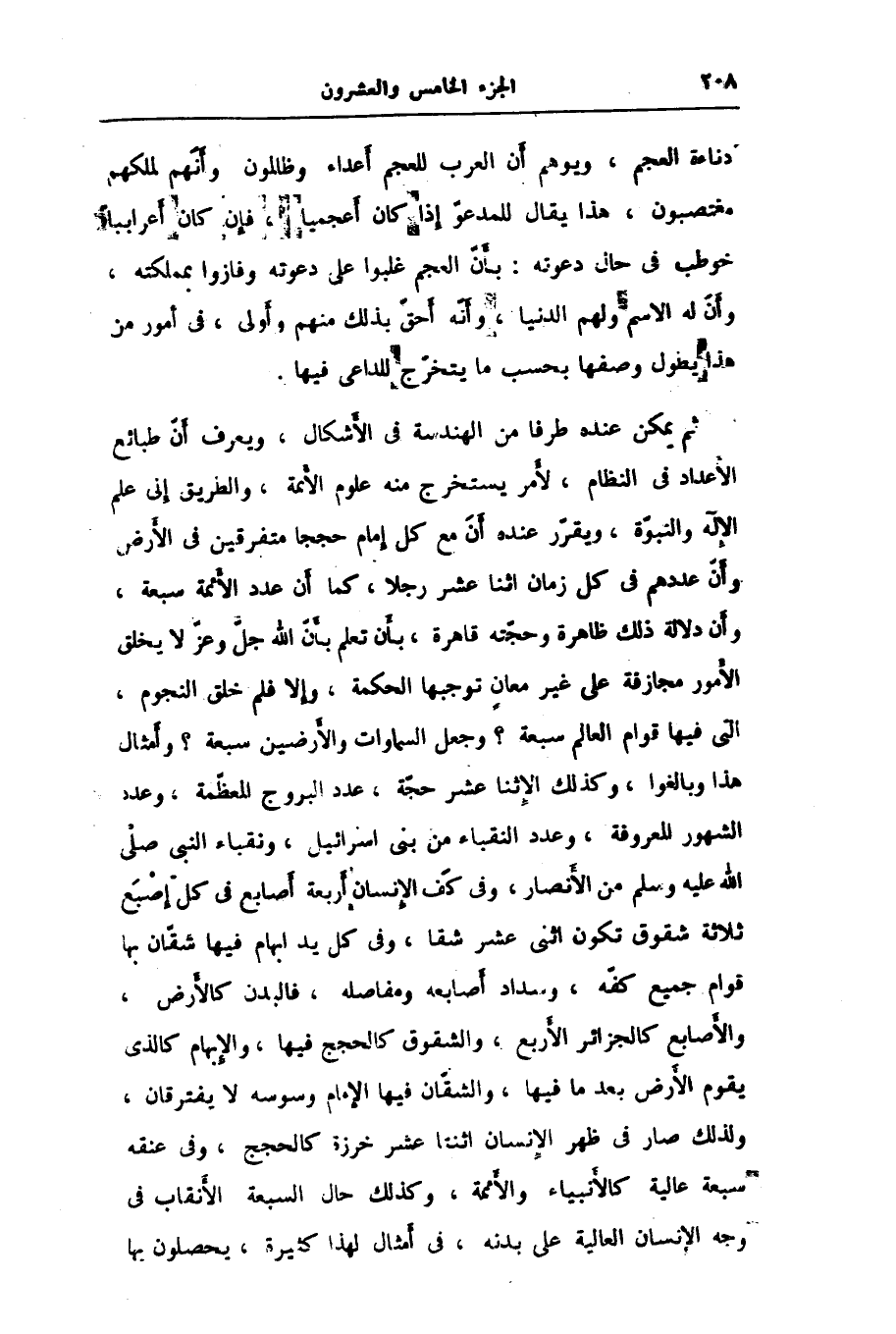 ثم يمكن عنده طرفا من الهندسة في الأشكال، ويعرف أنّ طبائع الأعداد في النظام، لأمر يستخرج منه علوم الأئمة، والطريق إلى علم الإله والنبوّة، ويقرّر عنده أنّ مع كل إمام حججا متفرقين في الأرض وأنّ عددهم في كل زمان اثنا عشر رجلا، كما أن عدد الأئمة سبعة، وأن دلالة ذلك ظاهرة وحجّته قاهرة، بأن تعلم بأنّ الله جلّ وعزّ لا يخلق الأمور مجازفة على غير معان توجبها الحكمة، وإلا فلم خلق النجوم، التى فيها قوام العالم سبعة؟ وجعل السماوات والأرضين سبعة؟ وأمثال هذا وبالغوا، وكذلك الإثنا عشر حجّة، عدد البروج المعظّمة، وعدد الشهور المعروفة، وعدد النقباء من بنى اسرائيل، ونقباء النبى صلى الله عليه وسلم من الأنصار، وفي كفّ الإنسان أربعة أصابع في كل إصبع ثلاثة شقوق تكون اثنى عشر شقا، وفي كل يد ابهام فيها شقّان بها قوام جميع كفّه، وسداد أصابعه ومفاصله، فالبدن كالأرض، والأصابع كالجزائر الأربع، والشقوق كالحجج فيها، والإبهام كالذى يقوم الأرض بعد ما فيها، والشقّان فيها الإمام وسوسه لا يفترقان، ولذلك صار في ظهر الإنسان اثنتا عشر خرزة كالحجج، وفي عنقه سبعة عالية كالأنبياء والأئمة، وكذلك حال السبعة الأنقاب في وجه الإنسان العالية على بدنه، فى أمثال لهذا كثيرة، يحصلون بها