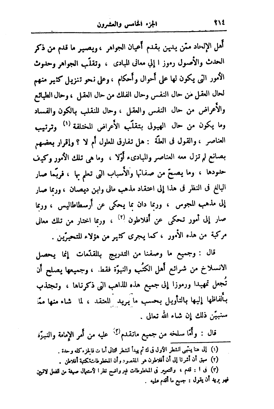 أهل الإلحاد ممّن يدين بقدم أعيان الجواهر، ويصير ما قدم من ذكر الحدث والأصول رموز إلى معانى المبادى، وتقلّب الجواهر وحدوث الأمور التى يكون لها على أحوال وأحكام، وعلى نحو تنزيل كثير منهم لحال العقل من حال النفس وحال الفلك من حال العقل، وحال الطبائع والأعراض من حال النفس والعقل، وحال المنقلب بالكون والفساد وما يكون من حال الهيولى بتقلّب الأعراض المختلفة «1» وترتيب العناصر، والقول في العلّة: هل تفارق المعلول أم لا؟ وإقرار بعضهم بصانع لم تزل معه العناصر والمبادىء أوّلا، وما هى تلك الأمور وكيف حدودها، وما يصحّ من صفاتها والأسباب التى تعلم بها، فربّما صار البالغ في النظر في هذا إلى اعتقاد مذهب مانى وابن ديصان، وربما صار إلى مذهب المجوس، وربما دان بما يحكى عن أرسطاطاليس، وربما صار إلى أمور تحكى عن أفلاطون «2» ، وربما اختار من تلك معانى مركبة من هذه الأمور، كما يجرى كثير من هؤلاء المتحيّرين.