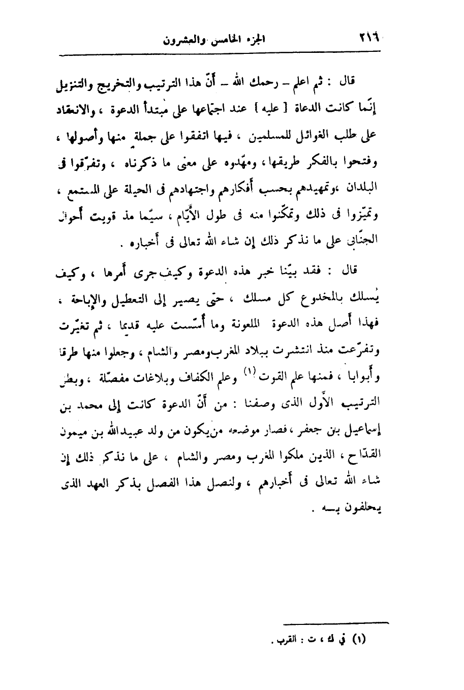 قال: ثم اعلم- رحمك الله- أنّ هذا الترتيب والتخريج والتنزيل إنّما كانت الدعاة [عليه] عند اجتماعها على مبتدأ الدعوة، والانعقاد على طلب الغوائل للمسلمين، فيها اتفقوا على جملة منها وأصولها، وفتحوا بالفكر طريقها، ومهّدوه على معنى ما ذكرناه، وتفرّقوا في البلدان، وتمهيدهم بحسب أفكارهم واجتهادهم في الحيلة على المستمع، وتميّزوا في ذلك وتمكّنوا منه في طول الأيّام، سيّما مذ قويت أحوال الجنّابى على ما نذكر ذلك إن شاء الله تعالى في أخباره.