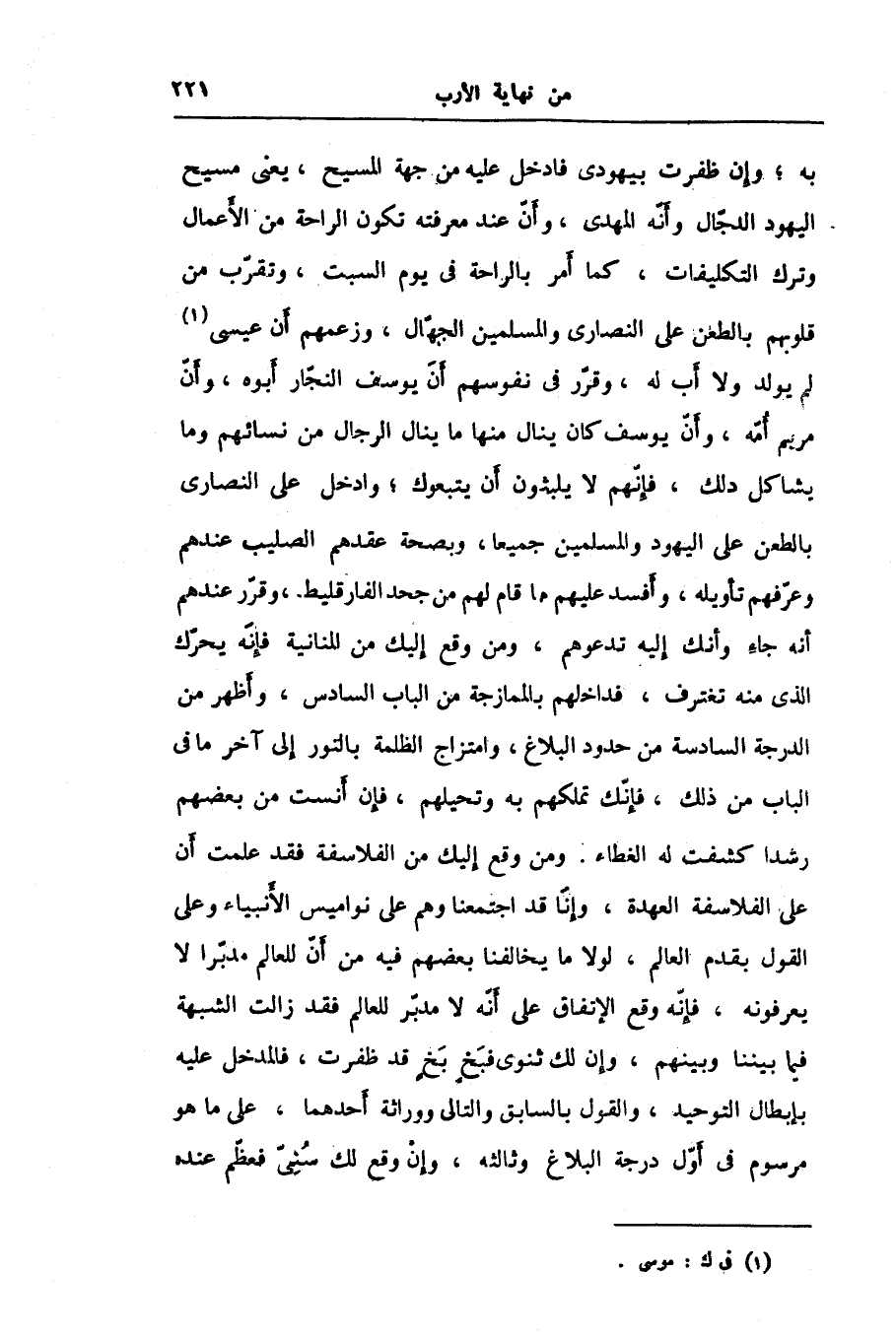 به؛ وإن ظفرت بيهودى فادخل عليه من جهة المسيح، يعنى مسيح اليهود الدجّال وأنّه المهدى، وأنّ عند معرفته تكون الراحة من الأعمال وترك التكليفات، كما أمر بالراحة في يوم السبت، وتقرّب من قلوبهم بالطعن على النصارى والمسلمين الجهّال، وزعمهم أن عيسى «1» لم يولد ولا أب له، وقرّر في نفوسهم أنّ يوسف النجّار أبوه، وأنّ مريم أمّه، وأنّ يوسف كان ينال منها ما ينال الرجال من نسائهم وما يشاكل ذلك، فإنّهم لا يلبثون أن يتبعوك؛ وادخل على النصارى بالطعن على اليهود والمسلمين جميعا، وبصحة عقدهم الصليب عندهم وعرّفهم تأويله، وأفسد عليهم مما قام لهم من جحد الفار قليط، وقرّر عندهم أنه جاء وأنك إليه تدعوهم، ومن وقع إليك من المنانية فإنّه يحرّك الذى منه تغترف، فداخلهم بالممازجة من الباب السادس، وأظهر من الدرجة السادسة من حدود البلاغ، وامتزاج الظلمة بالنور إلى آخر ما في الباب من ذلك، فإنّك تملكهم به وتحيلهم، فإن أنست من بعضهم رشدا كشفت له الغطاء. ومن وقع إليك من الفلاسفة فقد علمت أن على الفلاسفة العهدة، وإنّا قد اجتمعنا وهم على نواميس الأنبياء وعلى القول بقدم العالم، لولا ما يخالفنا بعضهم فيه من أنّ للعالم مدبّرا لا يعرفونه، فإنّه وقع الإتفاق على أنّه لا مدبّر للعالم فقد زالت الشبهة فيما بيننا وبينهم، وإن لك ثنوى فبخ بخ قد ظفرت، فالمدخل عليه بإبطال التوحيد، والقول بالسابق والتالى ووراثة أحدهما، على ما هو مرسوم في أوّل درجة البلاغ وثالثه، وإن وقع لك سنىّ فعظّم عنده