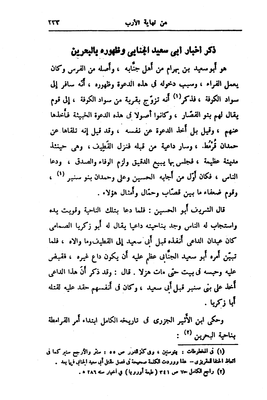 وحكى ابن الأثير الجزرى في تاريخه الكامل ابتداء أمر القرامطة بناحية البحرين «3» :