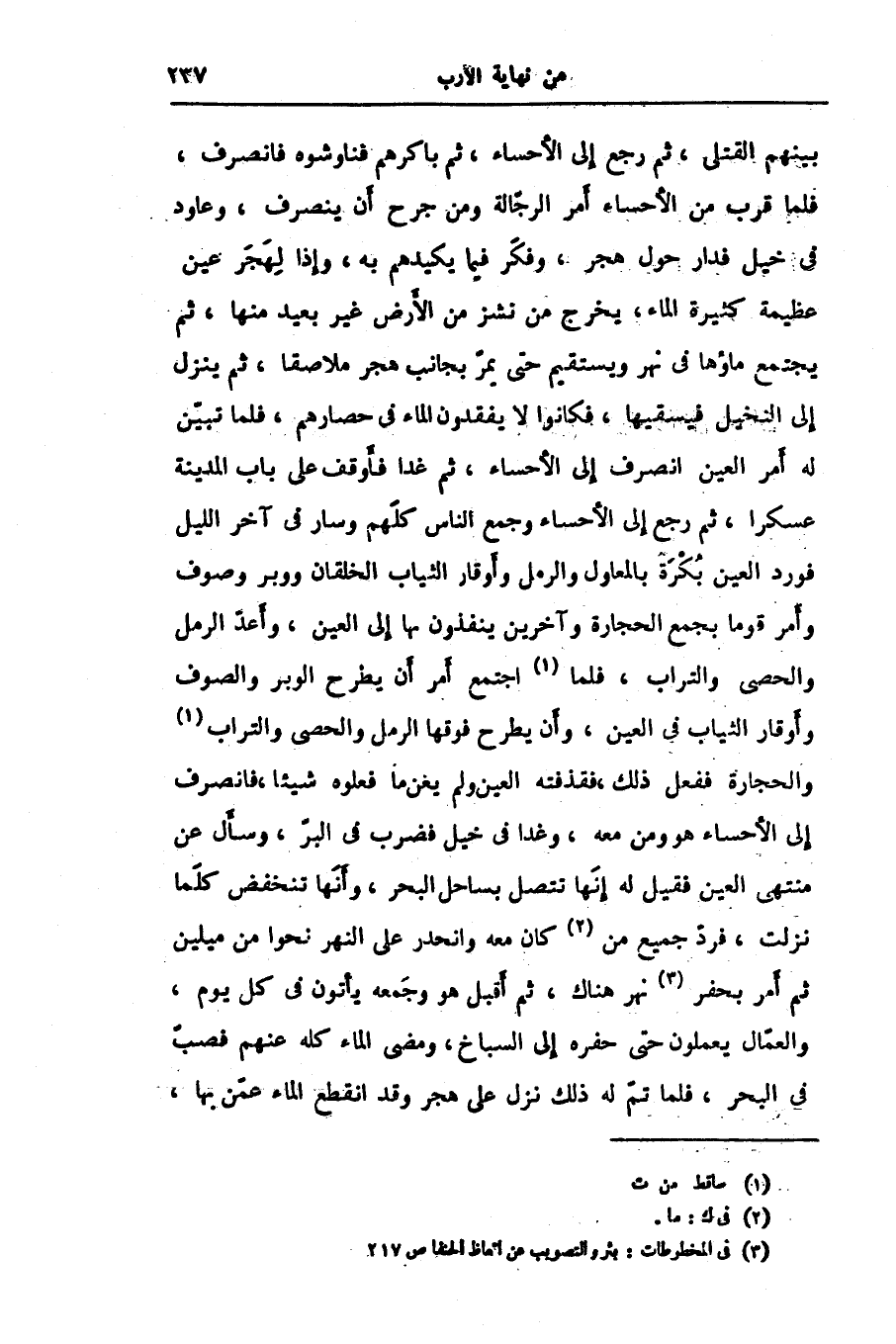 بينهم القتلى، ثم رجع إلى الأحساء، ثم باكرهم فناوشوه فانصرف، فلما قرب من الأحساء أمر الرجّالة ومن جرح أن ينصرف، وعاود فى خيل فدار حول هجر، وفكّر فيما يكيدهم به، وإذا لهجر عين عظيمة كثيرة الماء، يخرج من نشز من الأرض غير بعيد منها، ثم يجتمع ماؤها في نهر ويستقيم حتى يمرّ بجانب هجر ملاصقا، ثم ينزل إلى التخيل فيسقيها، فكانوا لا يفقدون الماء في حصارهم، فلما تبيّن له أمر العين انصرف إلى الأحساء، ثم غدا فأوقف على باب المدينة عسكرا، ثم رجع إلى الأحساء وجمع الناس كلّهم وسار في آخر الليل فورد العين بكرة بالمعاول والرمل وأوقار الثياب الخلقان ووبر وصوف وأمر قوما بجمع الحجارة وآخرين ينفذون بها إلى العين، وأعدّ الرمل والحصى والتراب، فلما «1» اجتمع أمر أن يطرح الوبر والصوف وأوقار الثياب في العين، وأن يطرح فوقها الرمل والحصى والتراب «2» والحجارة ففعل ذلك، فقذفته العين ولم يغن ما فعلوه شيئا، فانصرف إلى الأحساء هو ومن معه، وغدا في خيل فضرب في البرّ، وسأل عن منتهى العين فقيل له إنّها تتصل بساحل البحر، وأنّها تنخفض كلّما نزلت، فردّ جميع من «3» كان معه وانحدر على النهر نحوا من ميلين ثم أمر بحفر «4» نهر هناك، ثم أقبل هو وجمعه يأتون في كل يوم، والعمّال يعملون حتى حفره إلى السباخ، ومضى الماء كله عنهم فصبّ في البحر، فلما تمّ له ذلك نزل على هجر وقد انقطع الماء عمّن بها،