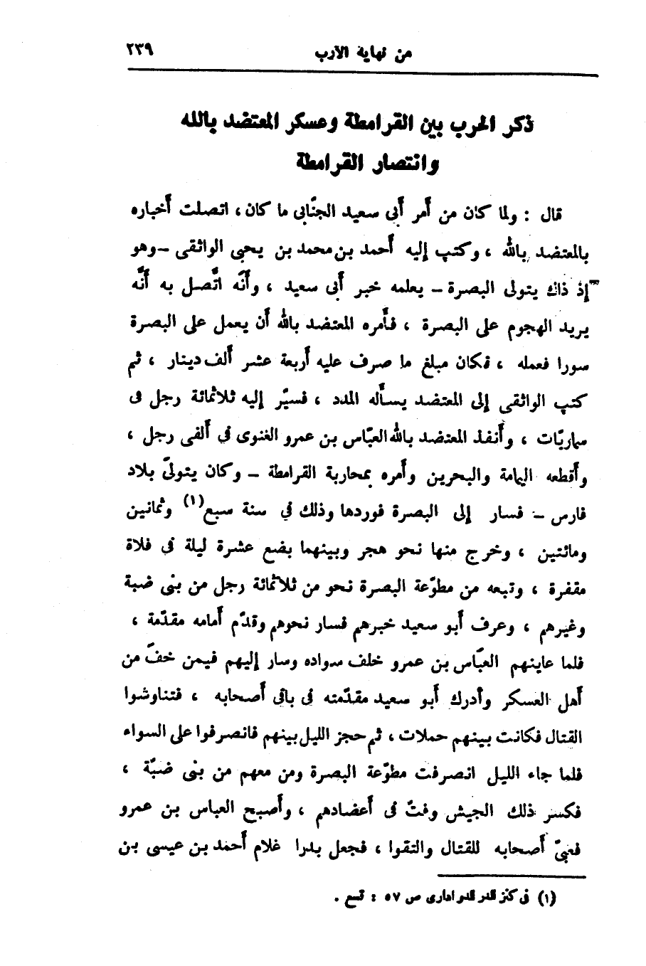 قال: ولما كان من أمر أبى سعيد الجنّابى ما كان، اتصلت أخباره بالمعتضد بالله، وكتب إليه أحمد بن محمد بن يحيى الواثقى- وهو إذ ذاك يتولى البصرة- يعلمه خبر أبى سعيد، وأنّه اتّصل به أنّه يريد الهجوم على البصرة، فأمره المعتضد بالله أن يعمل على البصرة سورا فعمله، فكان مبلغ ما صرف عليه أربعة عشر ألف دينار، ثم كتب الواثقى إلى المعتضد يسأله المدد، فسيّر إليه ثلاثمائة رجل في سماريّات، وأنفذ المعتضد بالله العبّاس بن عمرو الغنوى في ألفى رجل، وأقطعه اليمامة والبحرين وأمره بمحاربة القرامطة- وكان يتولّى بلاد فارس- فسار إلى البصرة فوردها وذلك في سنة سبع «1» وثمانين ومائتين، وخرج منها نحو هجر وبينهما بضع عشرة ليلة في فلاة مقفرة، وتبعه من مطوّعة البصرة نحو من ثلاثمائة رجل من بنى ضبة وغيرهم، وعرف أبو سعيد خبرهم فسار نحوهم وقدّم أمامه مقدّمة، فلما عاينهم العبّاس بن عمرو خلف سواده وسار إليهم فيمن خفّ من أهل العسكر وأدرك أبو سعيد مقدّمته في باقى أصحابه، فتناوشوا القتال فكانت بينهم حملات، ثم حجز الليل بينهم فانصرفوا على السواء فلما جاء الليل انصرفت مطوّعة البصرة ومن معهم من بنى ضبّة، فكسر ذلك الجيش وفتّ في أعضادهم، وأصبح العباس بن عمرو فعبّى أصحابه للقتال والتقوا، فجعل بدرا غلام أحمد بن عيسى بن