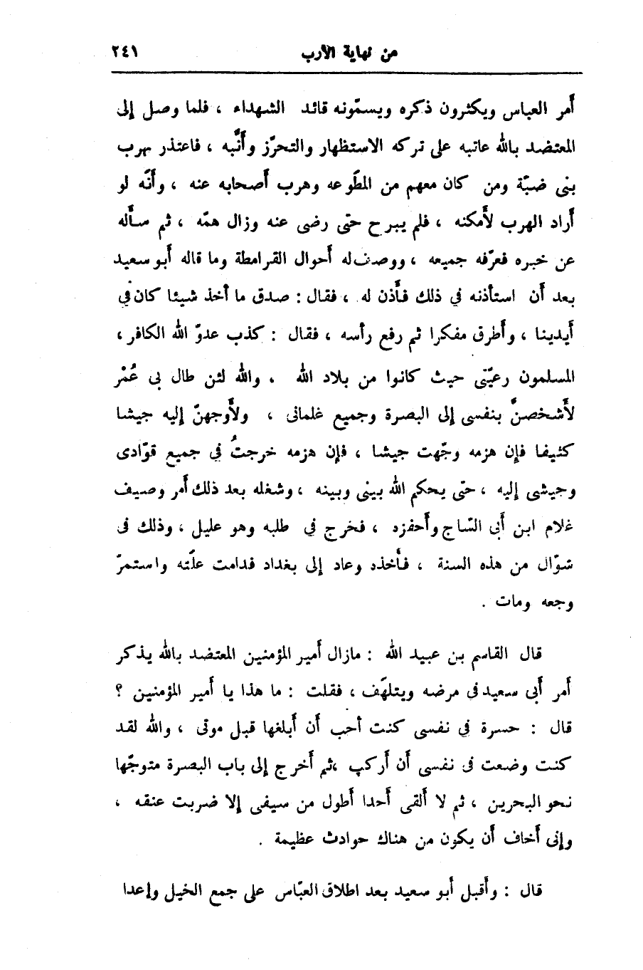 أمر العباس ويكثرون ذكره ويسمّونه قائد الشهداء، فلما وصل إلى المعتضد بالله عاتبه على تركه الاستظهار والتحرّز وأنّبه، فاعتذر بهرب بنى ضبّة ومن كان معهم من المطوّعه وهرب أصحابه عنه، وأنّه لو أراد الهرب لأمكنه، فلم يبرح حتى رضى عنه وزال همّه، ثم سأله عن خبره فعرّفه جميعه، ووصف له أحوال القرامطة وما قاله أبو سعيد بعد أن استأذنه في ذلك فأذن له، فقال: صدق ما أخذ شيئا كان في أيدينا، وأطرق مفكرا ثم رفع رأسه، فقال: كذب عدوّ الله الكافر، المسلمون رعيّتى حيث كانوا من بلاد الله، والله لئن طال بى عمر لأشخصنّ بنفسى إلى البصرة وجميع غلمانى، ولأوجهنّ إليه جيشا كثيفا فإن هزمه وجّهت جيشا، فإن هزمه خرجت في جميع قوّادى وجيشى إليه، حتى يحكم الله بينى وبينه، وشغله بعد ذلك أمر وصيف غلام ابن أبى السّاج وأحفزه، فخرج في طلبه وهو عليل، وذلك في شوّال من هذه السنة، فأخذه وعاد إلى بغداد فدامت علّته واستمرّ وجعه ومات.