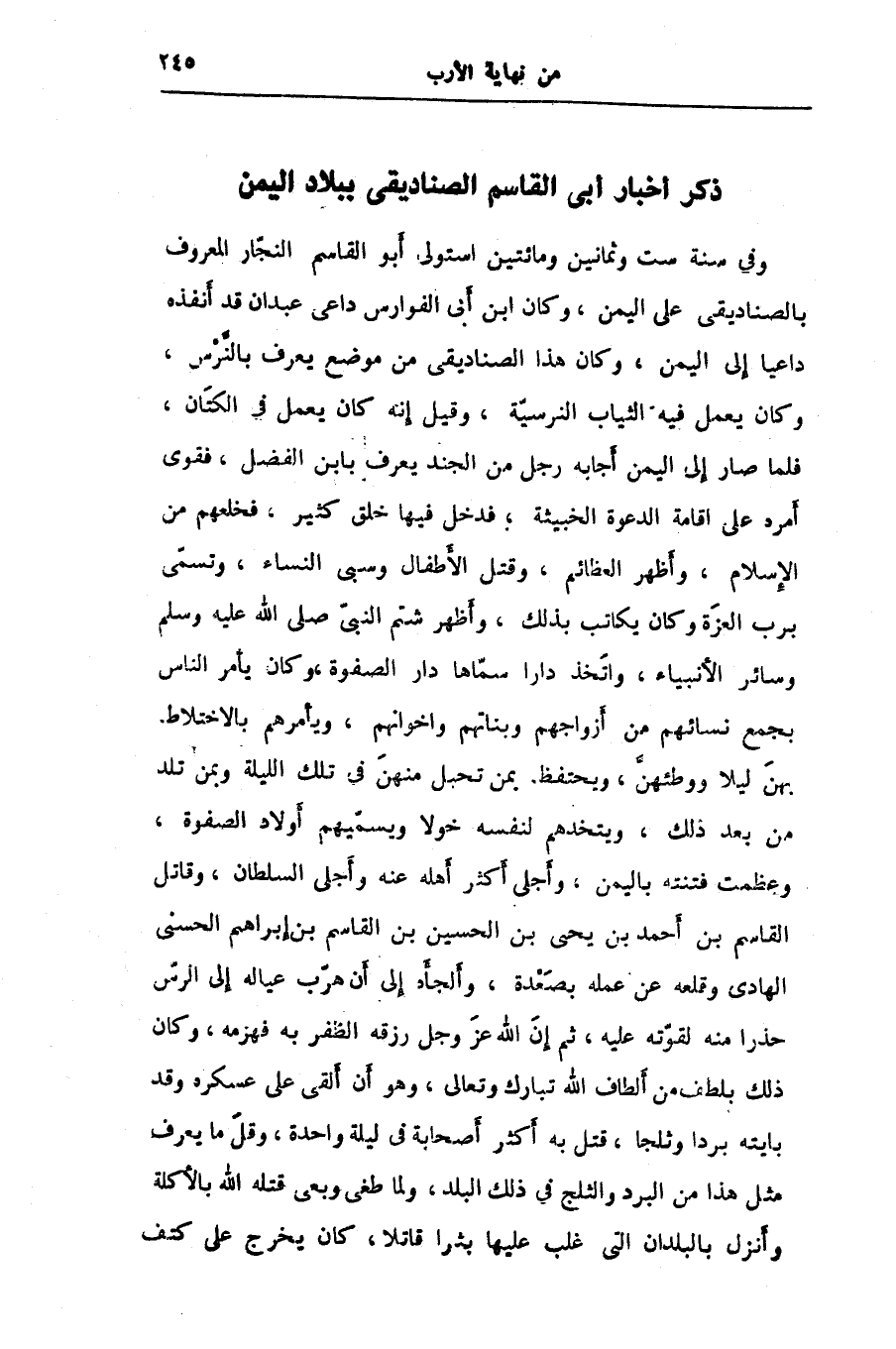 بهنّ ليلا ووطئهنّ، ويحتفظ بمن تحبل منهنّ في تلك الليلة وبمن تلد من بعد ذلك، ويتخذهم لنفسه خولا ويسمّيهم أولاد الصفوة، وعظمت فتنته باليمن، وأجلى أكثر أهله عنه وأجلى السلطان، وقاتل القاسم بن أحمد بن يحيى بن الحسين بن القاسم بن إبراهيم الحسنى الهادى وقلعه عن عمله بصعدة، وألجأه إلى أن هرّب عياله إلى الرسّ حذرا منه لقوّته عليه، ثم إنّ الله عزّ وجلّ رزقه الظفر به فهزمه، وكان ذلك بلطف من ألطاف الله تبارك وتعالى، وهو أن ألقى على عسكره وقد بايته بردا وثلجا، قتل به أكثر أصحابة في ليلة واحدة، وقلّ ما يعرف مثل هذا من البرد والثلج في ذلك البلد، ولما طغى وبعى قتله الله بالأكلة وأنزل بالبلدان التى غلب عليها بثرا قاتلا، كان يخرج على كتف