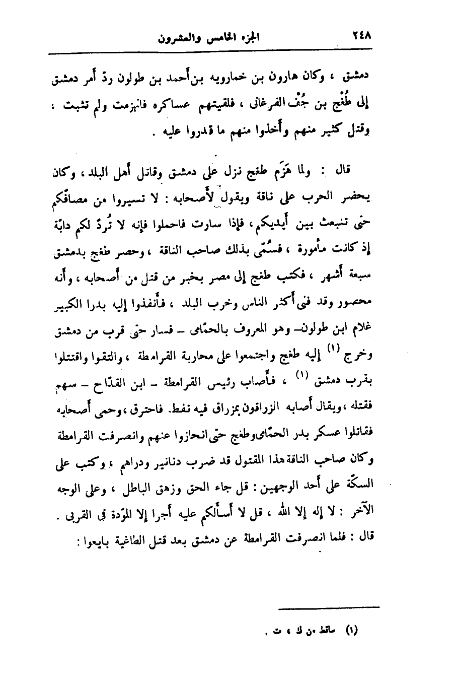 دمشق، وكان هارون بن خمارويه بن أحمد بن طولون ردّ أمر دمشق إلى طغج بن جف الفرغانى، فلقيتهم عساكره فانهزمت ولم تثبت، وقتل كثير منهم وأخذوا منهم ما قدروا عليه.