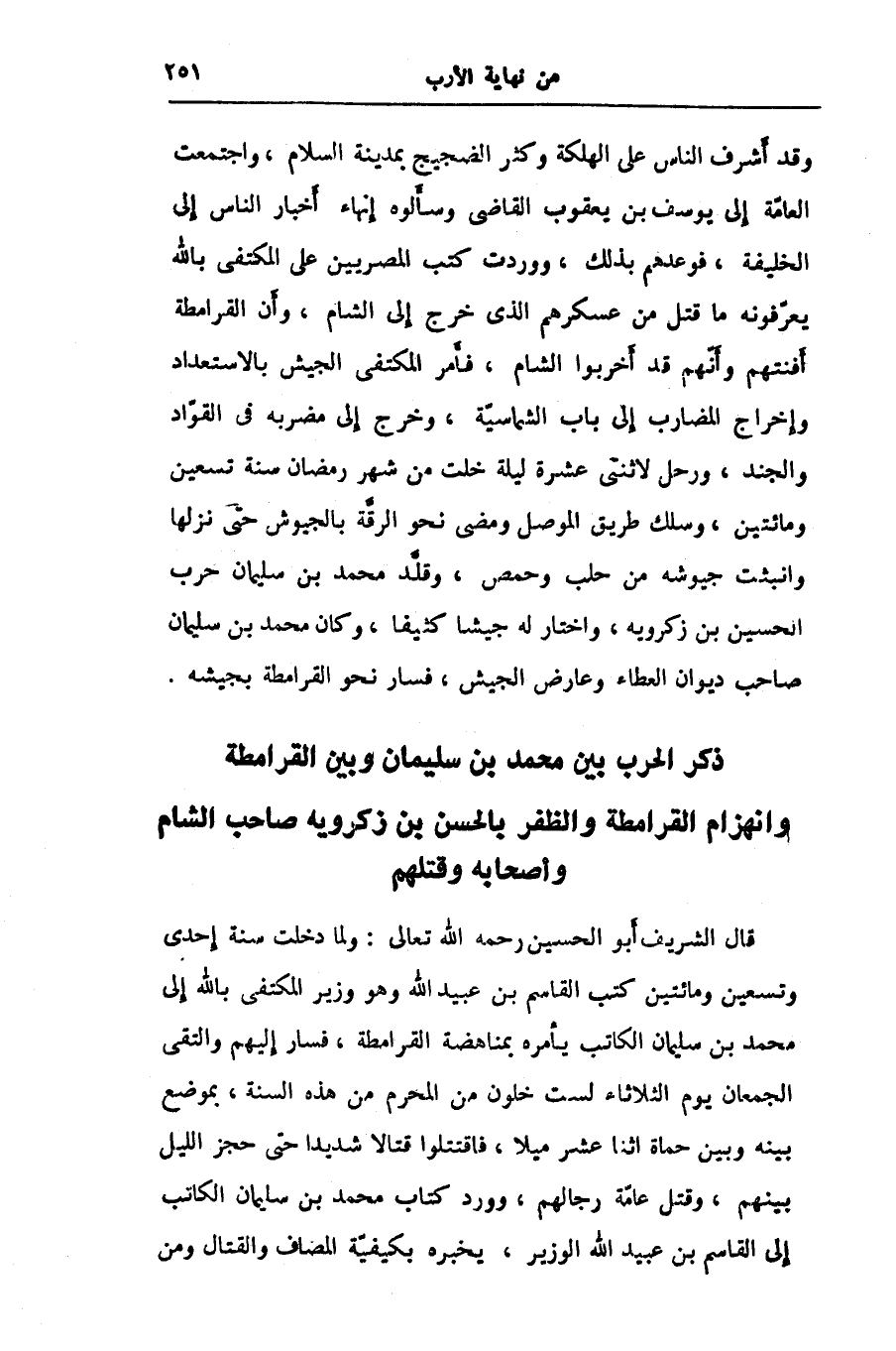 قال الشريف أبو الحسين رحمه الله تعالى: ولما دخلت سنة إحدى وتسعين ومائتين كتب القاسم بن عبيد الله وهو وزير المكتفى بالله إلى محمد بن سليمان الكاتب يأمره بمناهضة القرامطة، فسار إليهم والتقى الجمعان يوم الثلاثاء لست خلون من المحرم من هذه السنة، بموضع بينه وبين حماة اثنا عشر ميلا، فاقتتلوا قتالا شديدا حتى حجز الليل بينهم، وقتل عامّة رجالهم، وورد كتاب محمد بن سليمان الكاتب إلى القاسم بن عبيد الله الوزير، يخبره بكيفيّة المصاف والقتال ومن