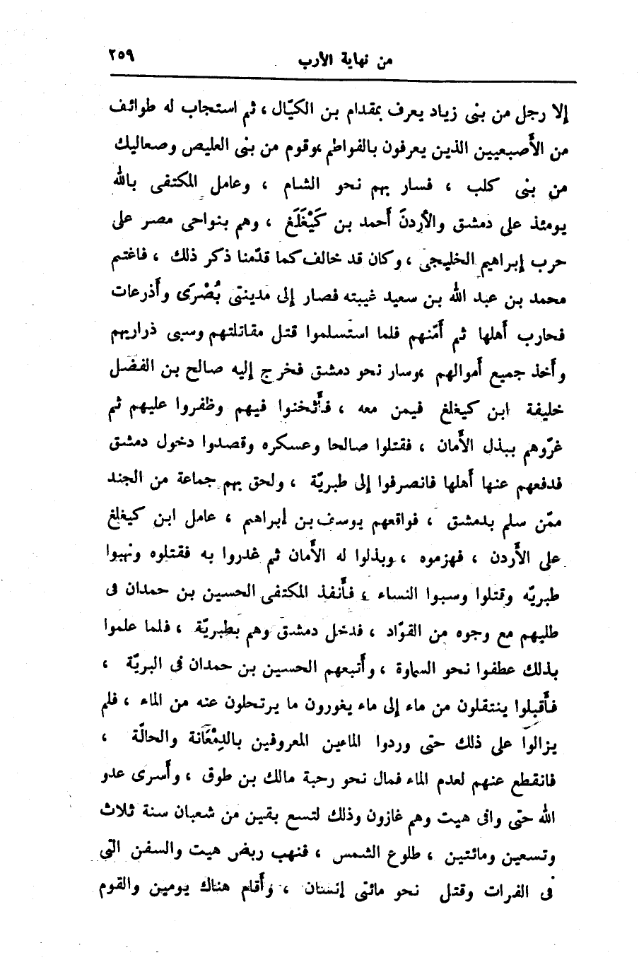 إلا رجل من بنى زياد يعرف بمقدام بن الكيّال، ثم استجاب له طوائف من الأصبعيين الذين يعرفون بالفواطم، وقوم من بنى العليص وصعاليك من بنى كلب، فسار بهم نحو الشام، وعامل المكتفى بالله يومئذ على دمشق والأردن أحمد بن كيغلغ، وهم بنواحى مصر على حرب إبراهيم الخليجى، وكان قد خالف كما قدّمنا ذكر ذلك، فاغتم محمد بن عبد الله بن سعيد غيبته فصار إلى مدينتى بصرى وأذرعات فحارب أهلها ثم أمّنهم فلما استسلموا قتل مقاتلتهم وسبى ذراريهم وأخذ جميع أموالهم، وسار نحو دمشق فخرج إليه صالح بن الفضل خليفة ابن كيغلغ فيمن معه، فأثخنوا فيهم وظفروا عليهم ثم غرّوهم ببذل الأمان، فقتلوا صالحا وعسكره وقصدوا دخول دمشق فدفعهم عنها أهلها فانصرفوا إلى طبريّة، ولحق بهم جماعة من الجند ممّن سلم بدمشق، فواقعهم يوسف بن إبراهيم، عامل ابن كيغلغ على الأردن، فهزموه، وبذلوا له الأمان ثم غدروا به فقتلوه ونهبوا طبريّه وقتلوا وسبوا النساء، فأنفذ المكتفى الحسين بن حمدان في طليهم مع وجوه من القوّاد، فدخل دمشق وهم بطبريّة، فلما علموا بذلك عطفوا نحو السماوة، وأتبعهم الحسين بن حمدان في البريّة، فأقبلوا ينتقلون من ماء إلى ماء يغورون ما يرتحلون عنه من الماء، فلم يزالوا على ذلك حتى وردوا الماءين المعروفين بالدمعانة والحالّة، فانقطع عنهم لعدم الماء فمال نحو رحبة مالك بن طوق، وأسرى عدو الله حتى وافى هيت وهم غازون وذلك لتسع بقين من شعبان سنة ثلاث وتسعين ومائتين، طلوع الشمس، فنهب ربض هيت والسفن التى فى الفرات وقتل نحو مائتى إنسان، وأقام هناك يومين والقوم