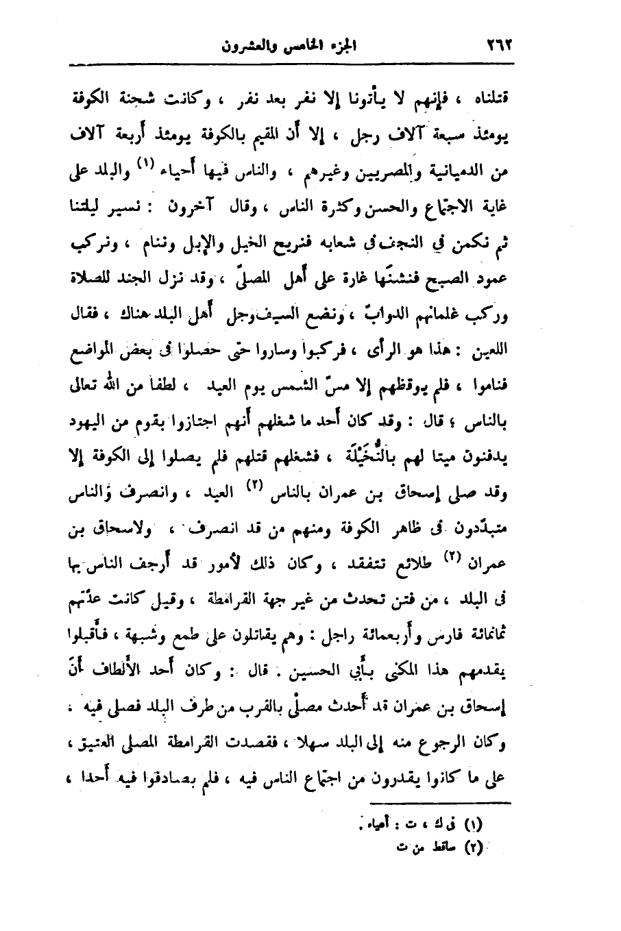 قتلناه، فإنهم لا يأتونا إلا نفر بعد نفر، وكانت شحنة الكوفة يومئذ سبعة آلاف رجل، إلا أن المقيم بالكوفة يومئذ أربعة آلاف من الدميانية والمصريين وغيرهم، والناس فيها أحياء «1» والبلد على غاية الاجتماع والحسن وكثرة الناس، وقال آخرون: نسير ليلتنا ثم نكمن في النجف في شعابه فنريح الخيل والإبل وننام، ونركب عمود الصبح فنشنّها غارة على أهل المصلّى، وقد نزل الجند للصلاة وركب غلمانهم الدوابّ، ونضع السيف وجل أهل البلد هناك، فقال اللعين: هذا هو الرأى، فركبوا وساروا حتى حصلوا في بعض المواضع فناموا، فلم يوقظهم إلا مسّ الشمس يوم العيد، لطفا من الله تعالى بالناس؛ قال: وقد كان أحد ما شغلهم أنهم اجتازوا بقوم من اليهود يدفنون ميتا لهم بالنّخيلة، فشغلهم قتلهم فلم يصلوا إلى الكوفة إلا وقد صلى إسحاق بن عمران بالناس «2» العيد، وانصرف والناس متبدّدون في ظاهر الكوفة ومنهم من قد انصرف، ولاسحاق بن عمران «3» طلائع تتفقد، وكان ذلك لأمور قد أرجف الناس بها فى البلد، من فتن تحدث من غير جهة القرامطة، وقيل كانت عدّتهم ثمانمائة فارس وأربعمائة راجل: وهم يقاتلون على طمع وشبهة، فأقبلوا يقدمهم هذا المكنى بأبى الحسين. قال: وكان أحد الألطاف أنّ إسحاق بن عمران قد أحدث مصلى بالقرب من طرف البلد فصلى فيه، وكان الرجوع منه إلى البلد سهلا، فقصدت القرامطة المصلى العتيق، على ما كانوا يقدرون من اجتماع الناس فيه، فلم بصادفوا فيه أحدا،